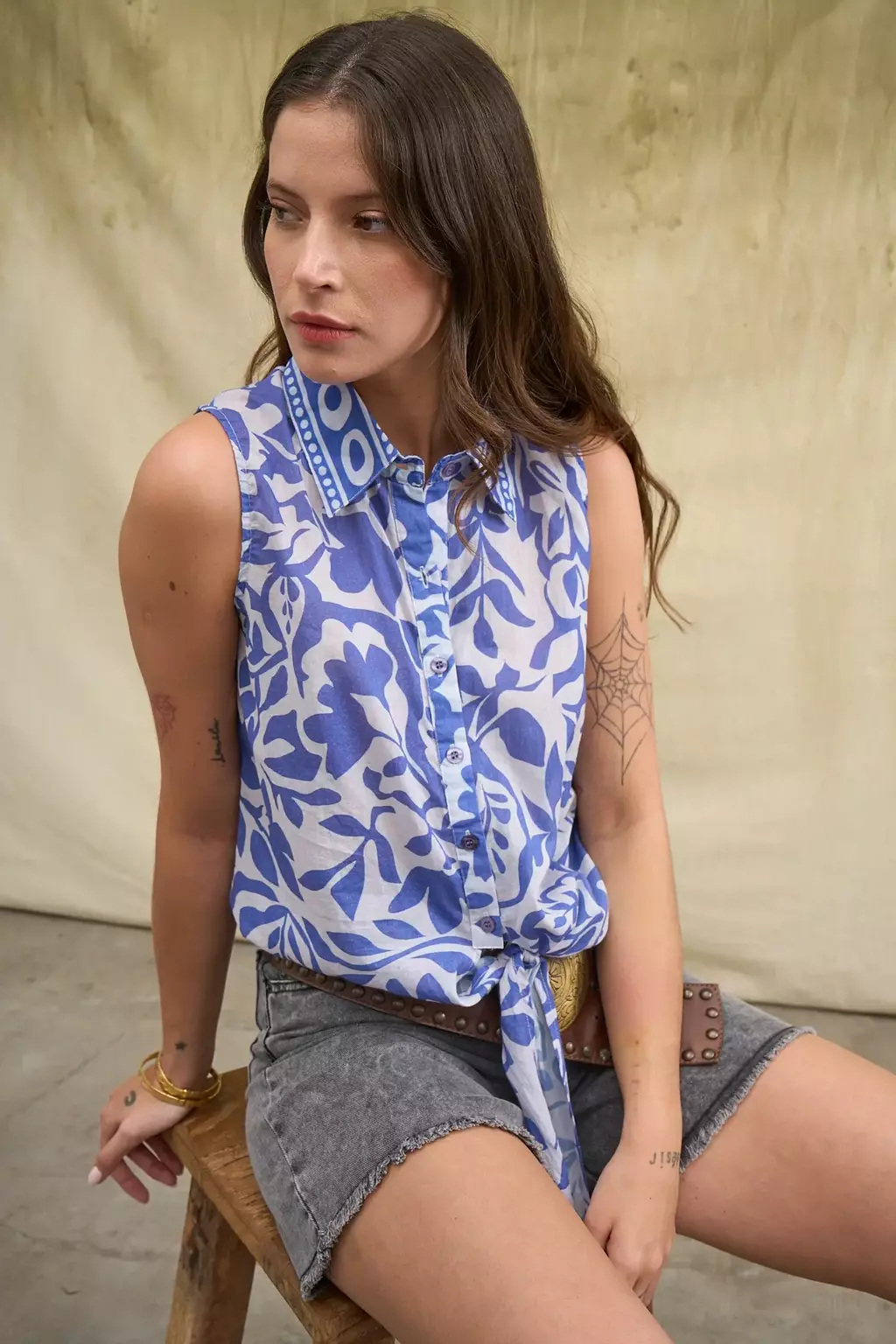 Blusa sin mangas con cuello camisero y botones a la vista en cartera. Posee tiras para atar en el ruedo delantero. Prenda confeccionada en India. La modelo usa talle S/M. Medidas talle S/M: Largo total: 57 cm / Ancho de hombro: 9 cm / Contorno de busto: 94 cm.
