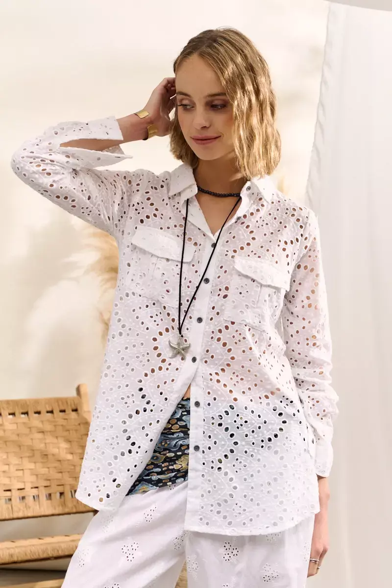 Camisa confeccionada en broderie con bolsillos delanteros. Producto importado de la India. La modelo usa talle S/M. Las medidas de una prenda talle S/M : Ancho de espalda: 38cm/ Contorno de pecho: 108cm/ Largo de manga: 63cm/ Largo: 72cm