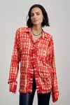 Camisa de tencel (fibra de pulpa de madera). Posee ajustes en los laterales, con tiras confeccionadas en la misma tela base. Este tejido se caracteriza por tener buen tacto, brillo y caída. Es un material sostenible y biodegradable. La modelo usa talle Small. Las medidas de una prenda talle small son: ancho de espalda: 55cm/ contorno de pecho: 110cm/ largo de manga: 45cm/ largo: 69cm