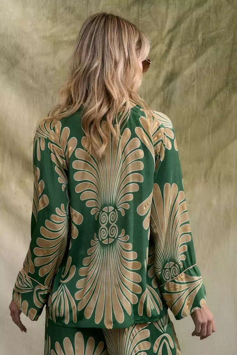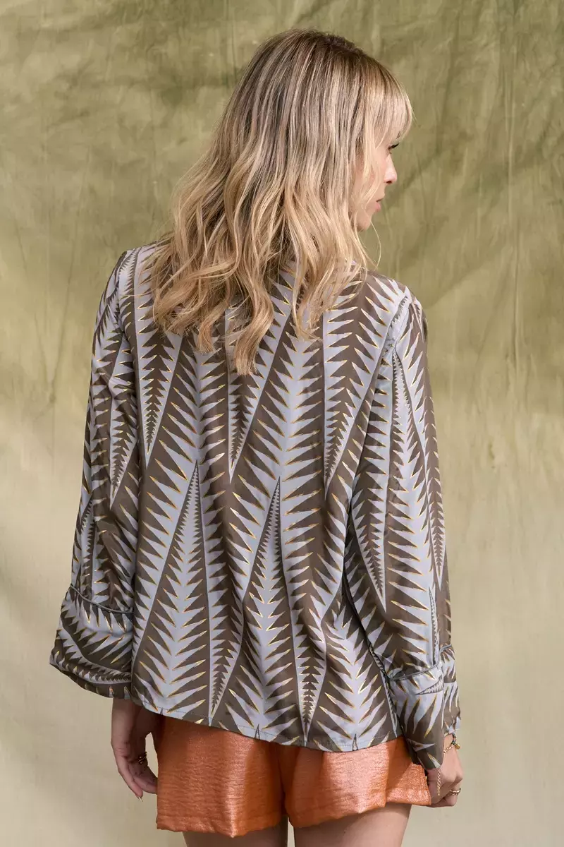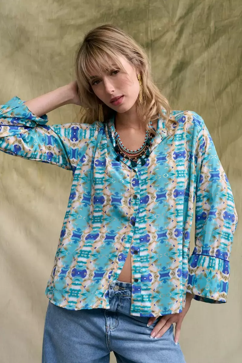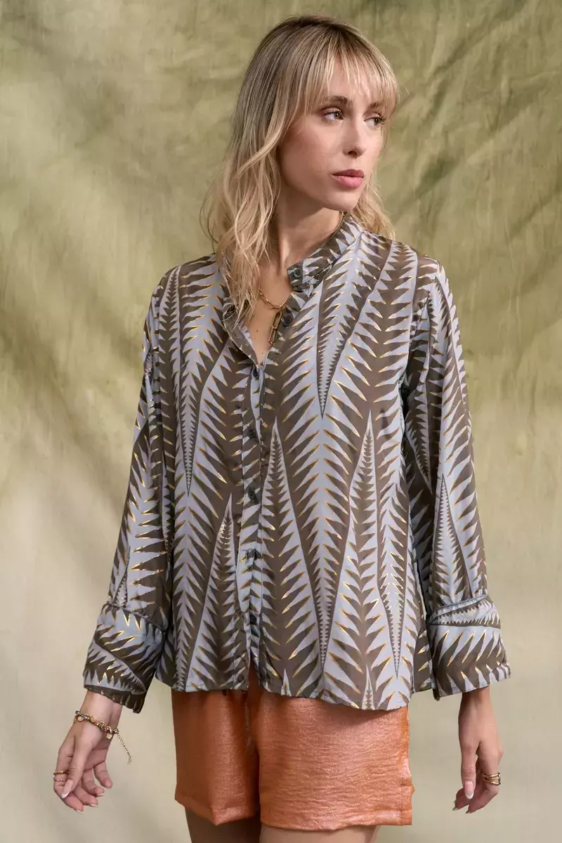 Camisa de seda estampada con detalles de hilos dorados propios del genero: con cartera de botones en el delatero y cuello mao. Posee detalle de vivo en la unión de los puńos. Es más larga atrás que adelante. La prenda viene dentro de una bolsita confeccionada en la misma tela base. La modelo usa talle S/M. Las medidas de una prenda talle S/M son: Contorno de pecho: 104cm/ Largo: 62cm Producto importado de la india.