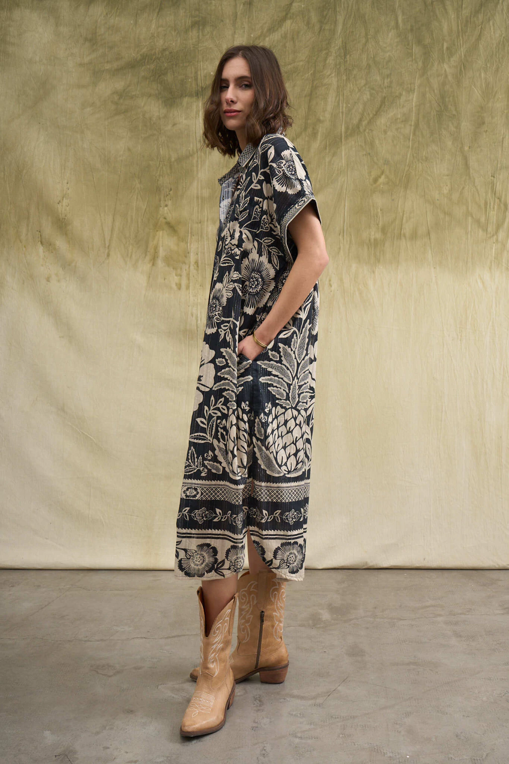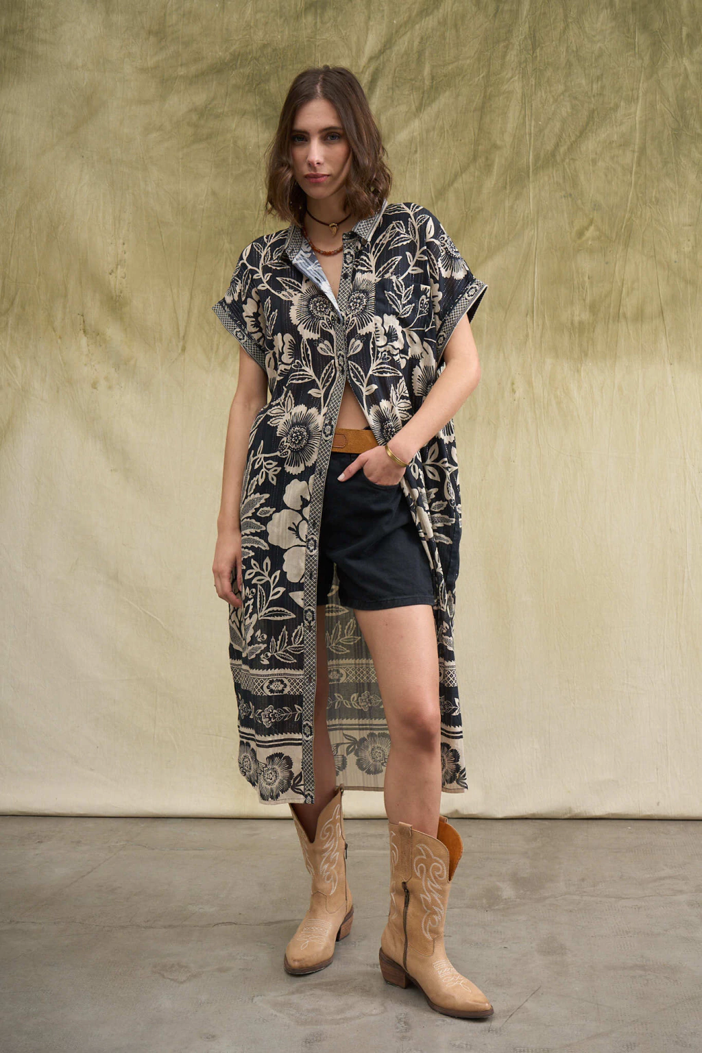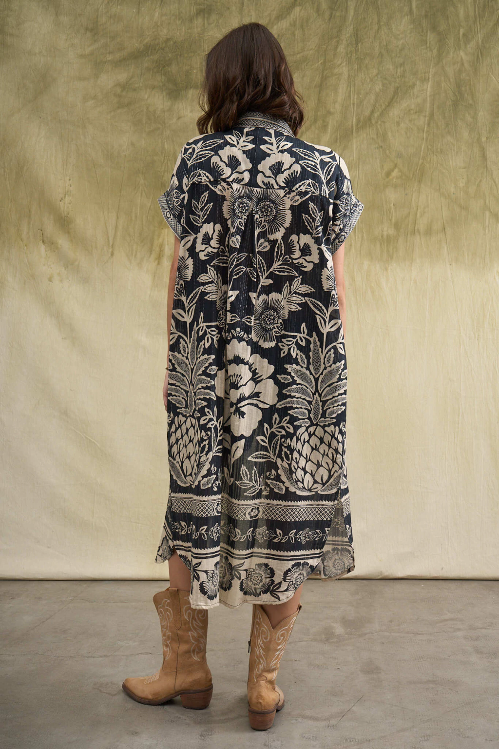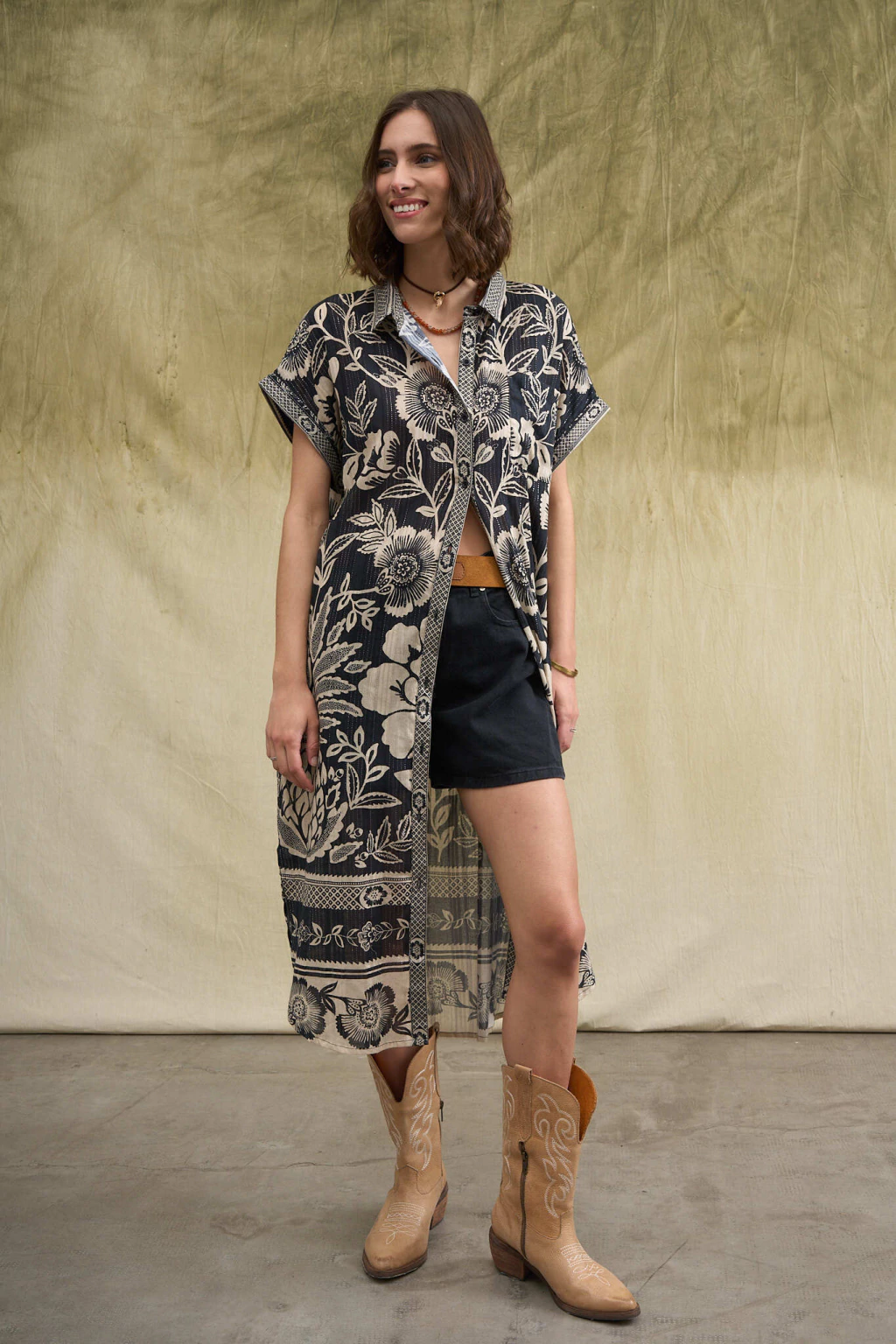 Camisa larga estampada, de manga corta y corte clásico. La tela posee detalles de hilos de lurex. Prenda confeccionada en India. La modelo usa talle S/M. Medidas talle S/M: Largo total: 116 cm / Contorno de busto: 122 cm / Ancho de hombro + Largo de manga: 27 cm.