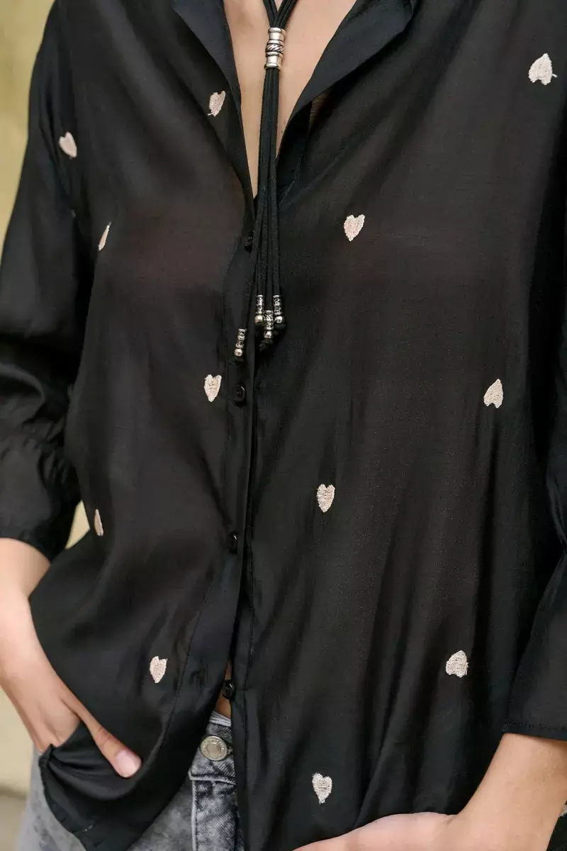 Camisa de tencel bordado (fibra de pulpa de madera). Este tejido se caracteriza por tener buen tacto, brillo y caída. Es un material sostenible y biodegradable. Tiene botones en el delantero y elástico a la altura del codo para generar un pequeño frunce. La modelo usa talle Small. Las medidas de una prenda talle Small son: ancho de espalda: 49cm/ contorno de pecho: 112cm/ largo de manga: 39cm/ largo: 68cm