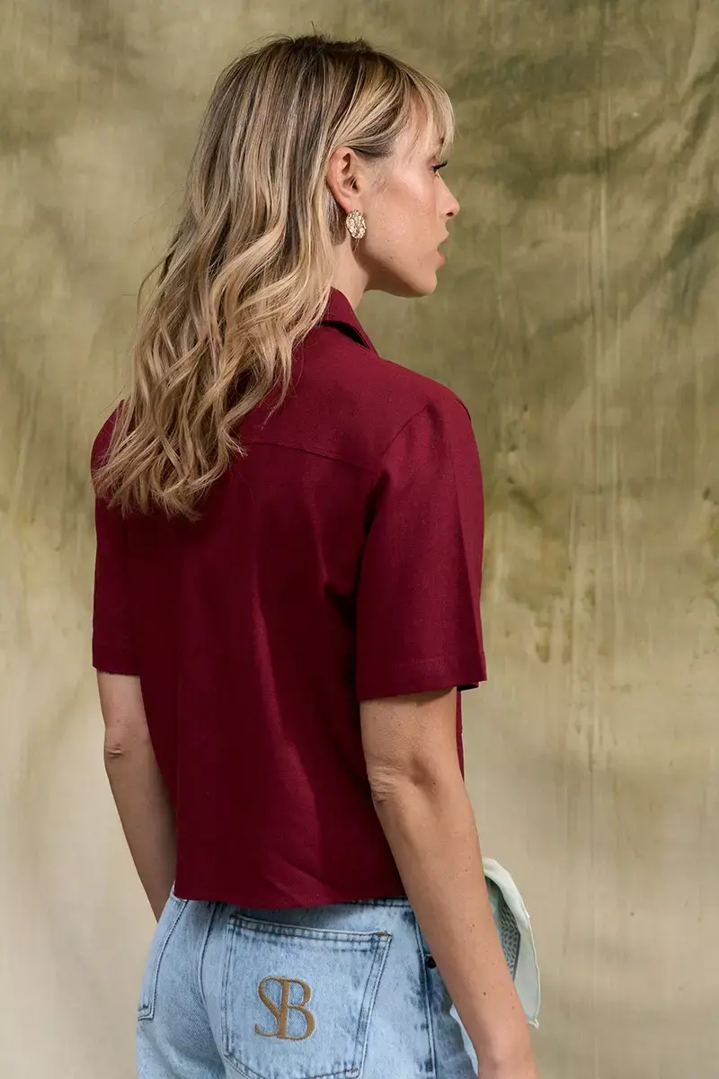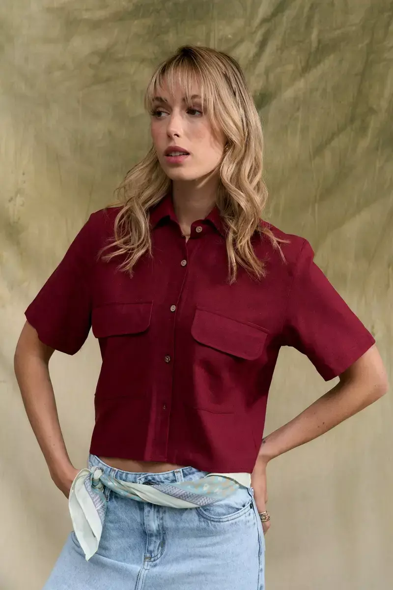 Camisa manga corta confeccionada en lino, con bolsillos plaqué en delantero y botones de coco. La modelo usa talle Small. Las medidas de una prenda talle Small son: Ancho de espalda: 39cm/ Largo de manga: 24cm/ Contorno de pecho: 95cm/ Largo delantero: 46cm
