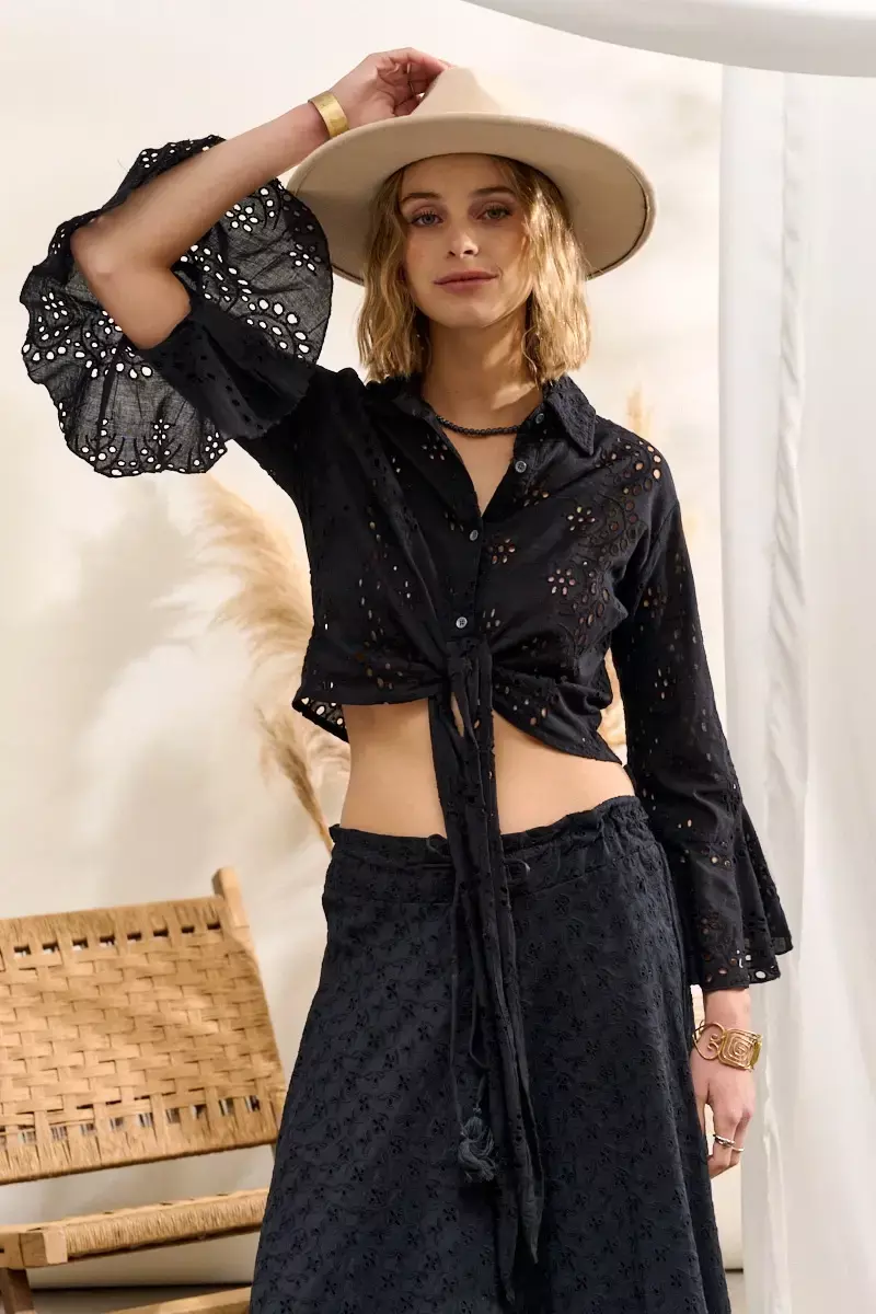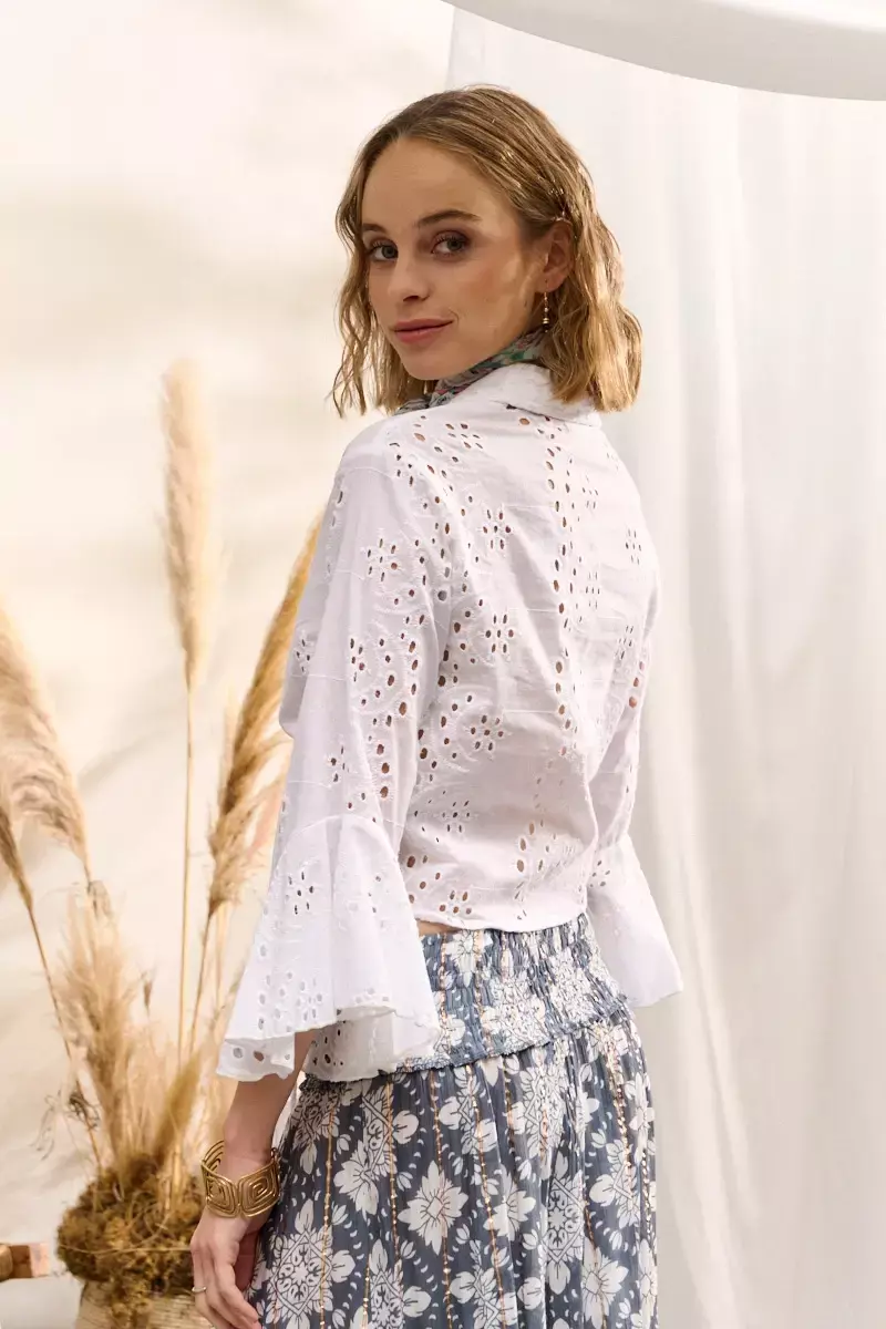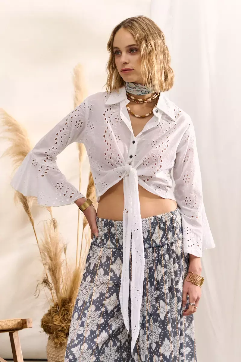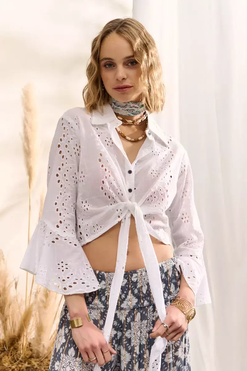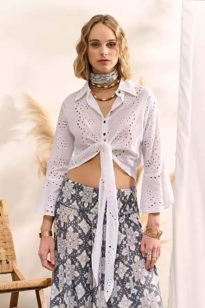 Camisa confeccionada en broderie Posee cartera en delantero y mangas 3/4 amplias con vuelo. Tiras en cintura delantera para anudar. Producto importado de India. La modelo usa talle S/M. Medidas talle S/M: Largo total: 46 cm / Contorno de pecho: 102 cm / Ancho de hombro: 14 cm / Largo de manga: 51 cm