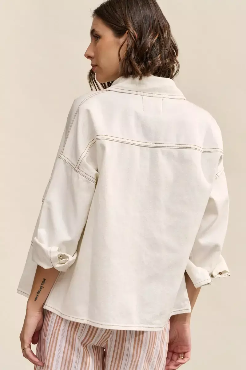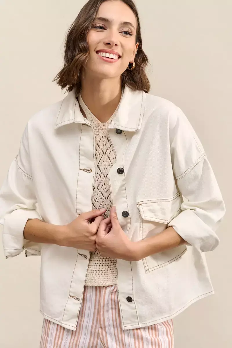 Campera realizada en algodon 100%. Corte recto, manga caida y con cartera al frente. Color crudo cosido con hilo a contratono camel. Tiene un bolsillo delantero. Botones en baño cobre. La modelo usa talle S.