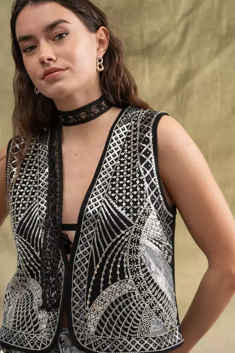 Chaleco gamuzado, completamente bordado en el delantero Posee un ganchito a modo de acceso. La modelo usa talle S. Medidas talle S: Ancho de hombro: 9 cm / Contorno de pecho: 92 cm/ Largo Total: 51 cm