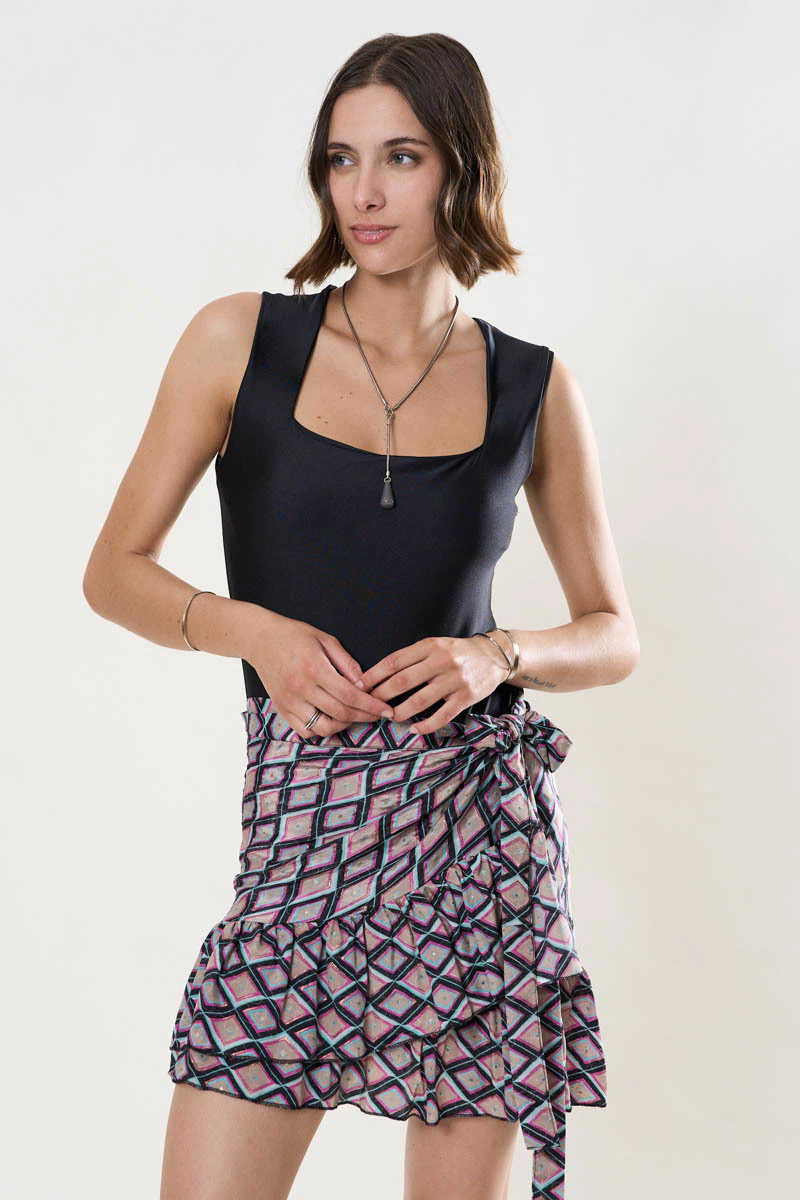 Pollera corta en Sari estampado con hilos dorados. Modelo de falda cruzada con lazo y volado. De muy linda caída. Modelo adaptable a cualquier tipo de cuerpo. Prenda confeccionada en India. La modelo usa talle único. Medidas talle U: Largo total 40cm