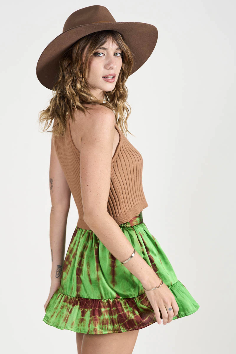 Falda corta de seda teñida por medio de técnica artesanal tie dye. Tiene elástico en la parte posterior de la cintura. Producto importado de la India. La prenda viene dentro de una bolsita confeccionada en la misma tela base. La modelo usa talle Small. Las medidas de una prenda talle Small son: Contorno de cintura: 62cm/ Largo: 36cm