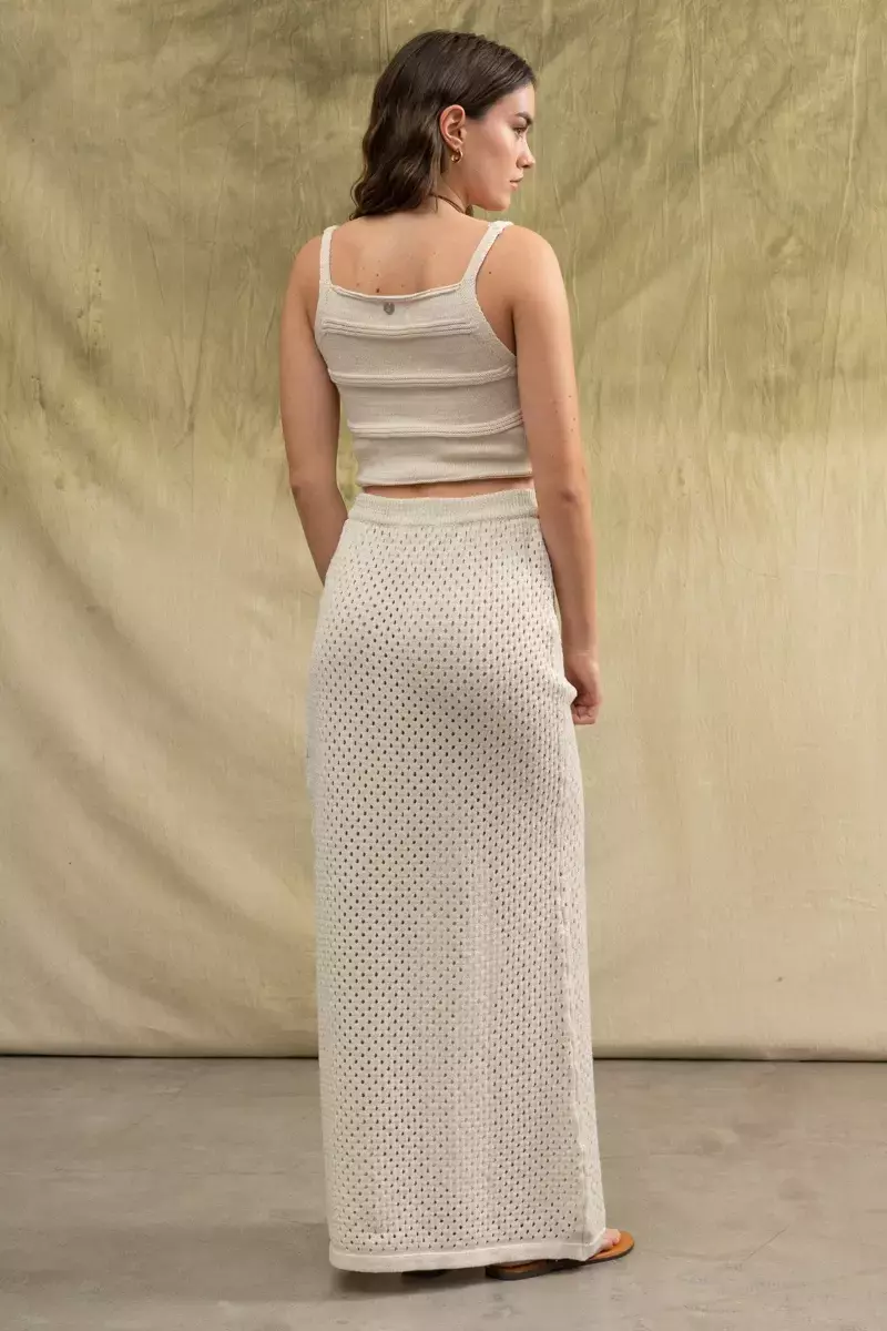 Falda larga confeccionada en un tejido liviano, con detalles de lurex. Posee ajuste con tira para atar en cintura, y tajo en el delantero. Tejido 100% algodón, calado en todo su recorrido. La modelo usa talle S. Medidas talle S: Largo total: 107 cm / Contorno de cintura: 66 cm / Largo de tajo: 64 cm.