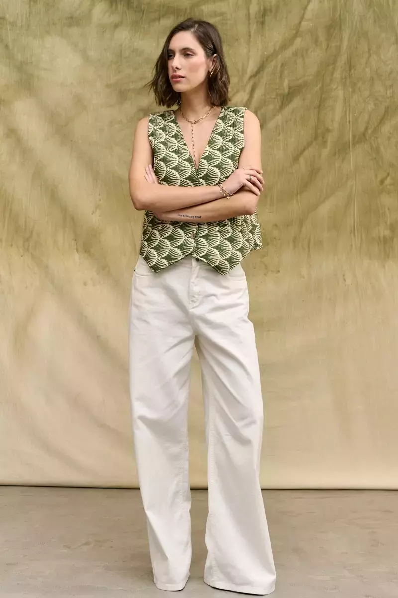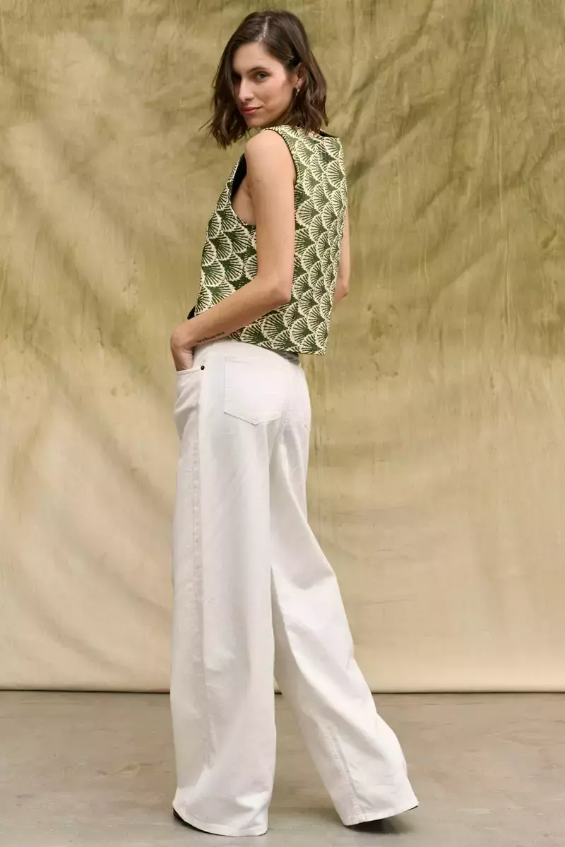Jean Palazzo tiro alto en denim rigido 100% algodon. Boton y tachas en baño plata vieja, etiqueta de marca en Pu color marron. Modelo de calce super cómodo, con pierna amplia a partir de la cadera, ideal para uso diario y outfits casuales. La modelo usa talle 24. Medidas talle 24: Largo total: 110 cm / Contorno de cintura: 68 cm / Tiro delantero: 33 cm / Tiro Trasero: 41 cm.