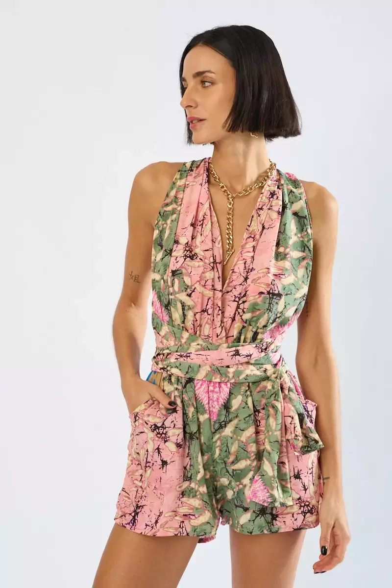 Mono corto confeccionado con piezas enteras de seda de sari y por su forma de confección, la estampa puede variar entre uno y otro, haciendo que cada una sea única. Posee 2 tiras largas que dan libertad a anudarlo como cada uno desee en cuello, espalda o cintura. Posee bolsillos laterales y elástico en todo el recorrido de cintura. La prenda viene dentro de una bolsita confeccionada en la misma tela base. Prenda confeccionada en India. La modelo usa talle S/M.