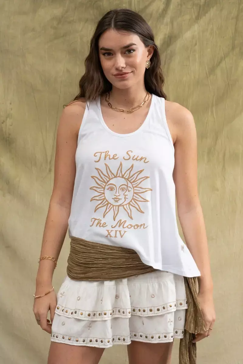 Musculosa de jersey de algodón con estampa en el frente. Tiene recorte con un leve frunce en la espalda. La modelo usa talle Small. Las medidas de una prenda talle Small son: Contorno de pecho: 84cm Largo delantero: 53cm