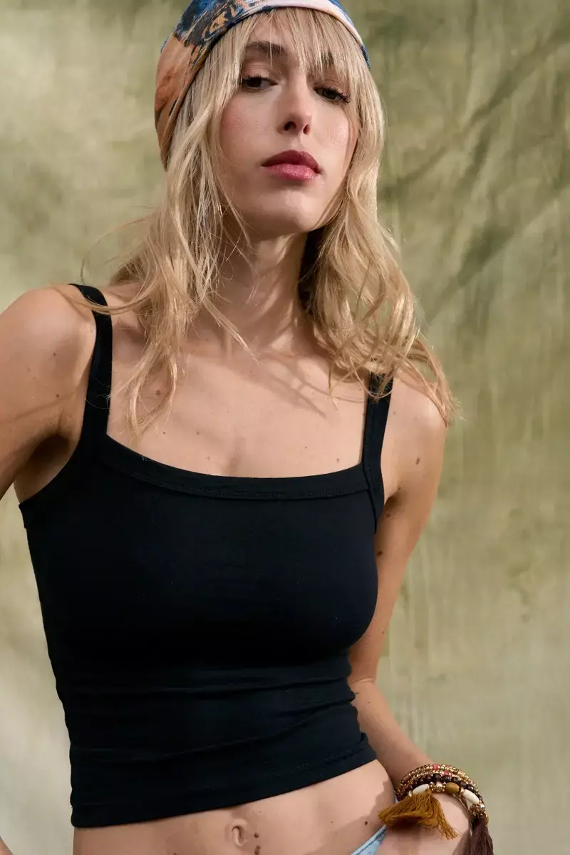 Musculosa de algodón con elastano. La modelo usa talle Small. Las medidas de una prenda talle Small son: Contorno de pecho: 64cm Largo: 42cm