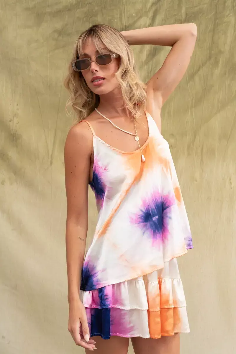 Musculosa de breteles regulables, confeccionado en seda teñida por medio de técnica artesanal tie dye. La modelo usa talle S. Medidas talle S: Largo total: 61 cm / Contorno de busto: 82 cm