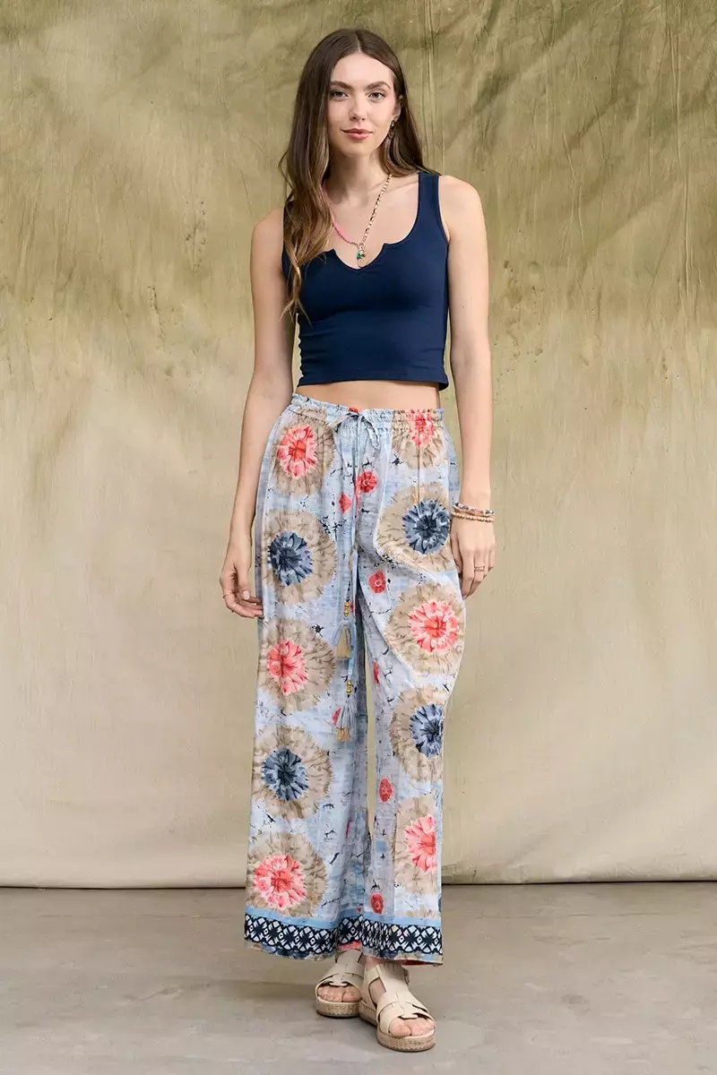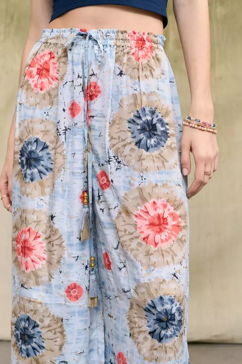 Pantalón confeccionado en seda Sari, con detalles en hilos dorados propios del género. Producto fabricado en la India. Posee cintura elastizada y tiras para atar, con cuentas doradas y flecos decorativos. Modelo muy amplio y de buena caída. Piernas con corte recto. La prenda viene dentro de una bolsita confeccionada en la misma misma seda Sari. La modelo usa talle S/M. Medidas talle S/M: Largo total: 92 cm / Contorno de cintura: 60 cm / Contorno de ruedo: 60 cm