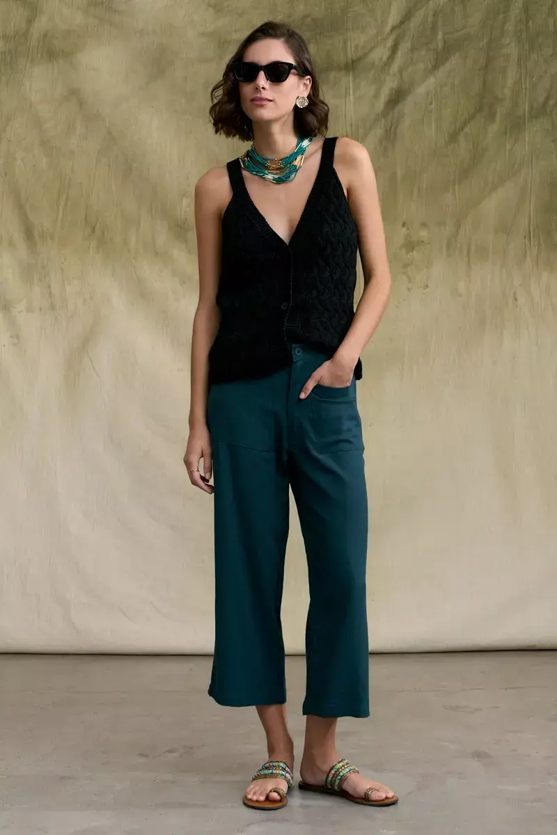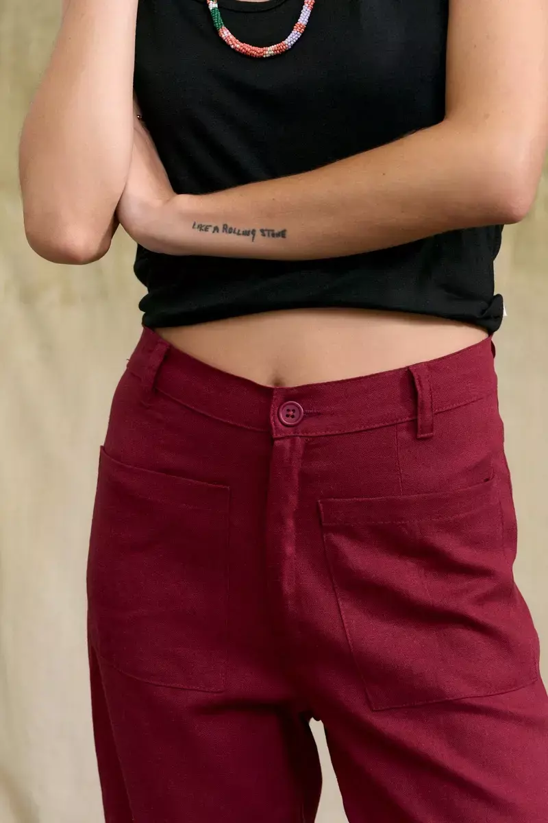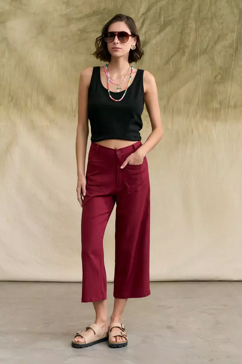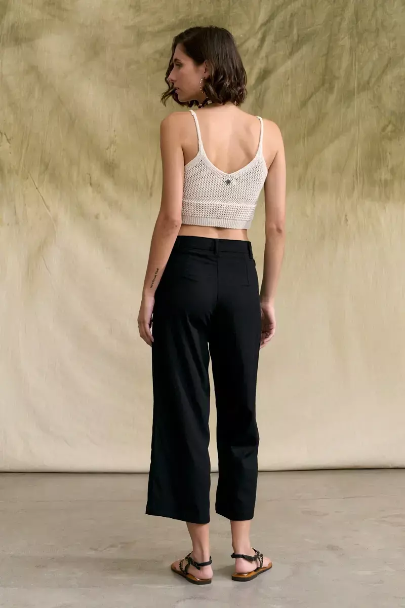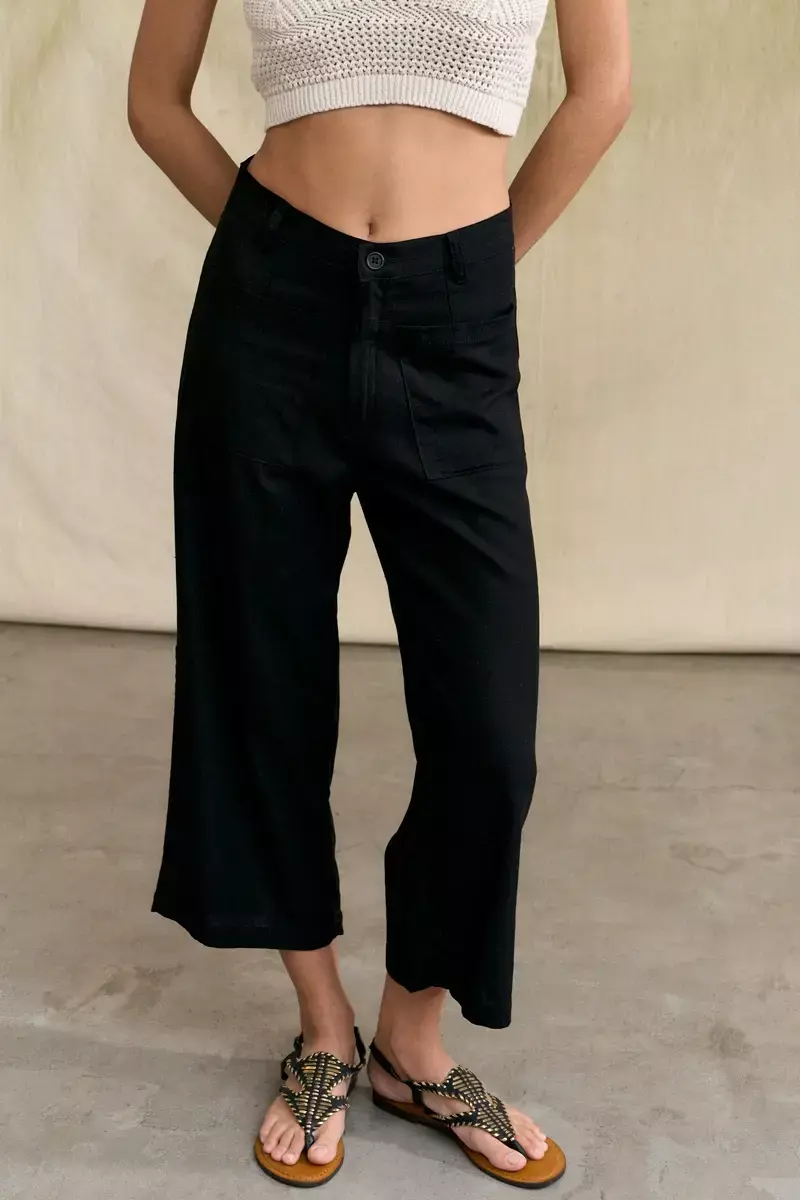Pantalón tipo sastrero confeccionado en lino. Largo crop. Posee bolsillos grandes aplicados en delantero. Modelo de corte recto, tiro medio y adaptable a cualquier tipo de cuerpo. Cintura con presillas y botón. La modelo usa talle Small. Medidas talle S: Largo total: 83 cm / Contorno de cintura: 70 cm / Contorno de Botamanga: 50 cm.