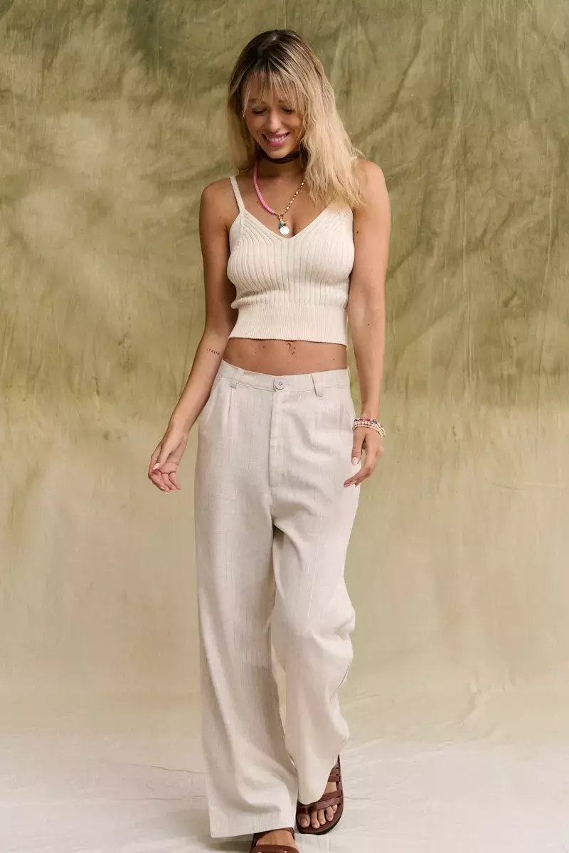 Pantalón tipo sastrero confeccionado en lino a rayas con lurex. Modelo de corte recto, tiro medio y adaptable a cualquier tipo de cuerpo. Cintura con presillas y botón. La modelo usa talle Small. Medidas talle S: Largo total: 102 cm / Contorno de cintura: 70 cm / Contorno de Botamanga: 52 cm.