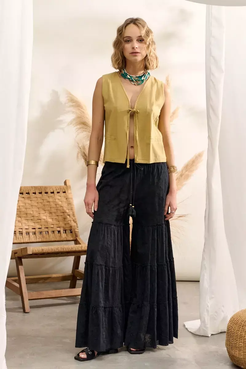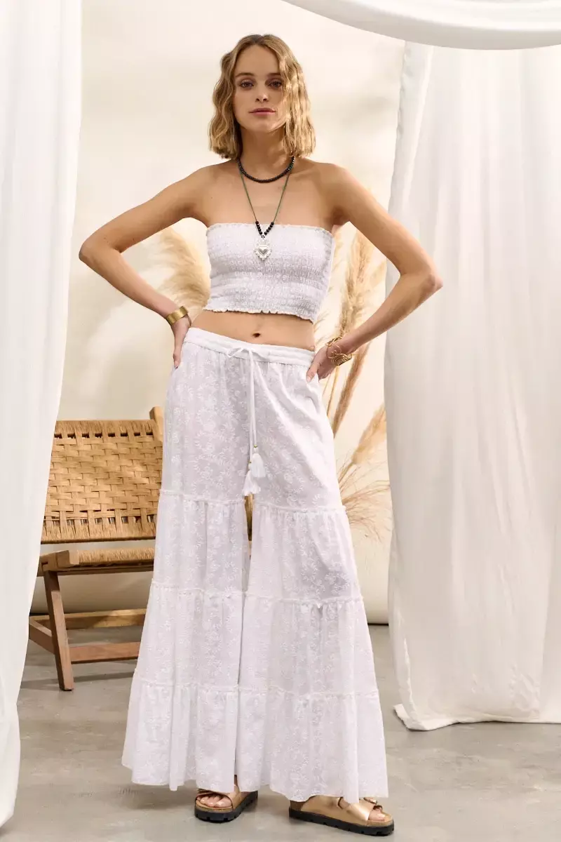 Pantalón pollera con cintura alta elástica, confeccionado en broderie. Modelo muy amplio y con buena caída al cuerpo. Corte de piernas acampanada. Prenda confeccionada en India. La modelo usa talle S/M. Las medidas de una prenda talle S/M son: Contorno de cintura: 62cm (Cede hasta 90cm)/ Largo: 105cm