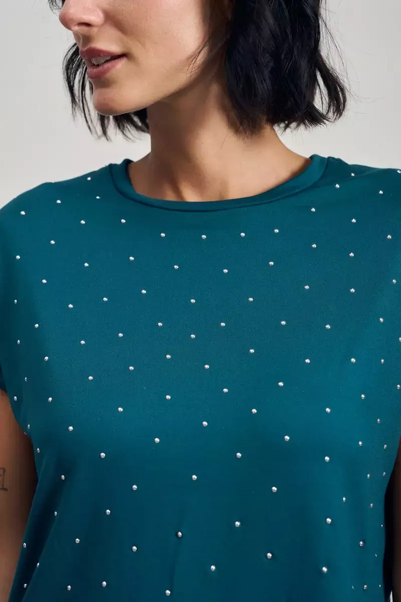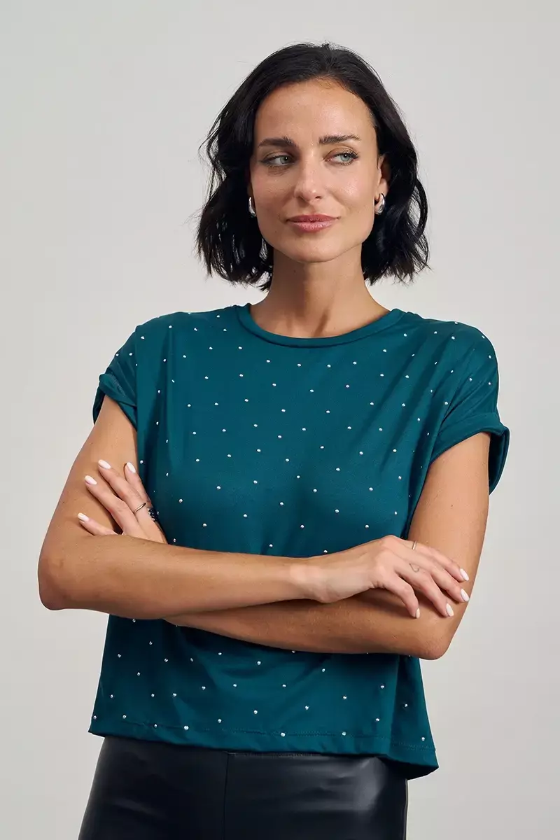 Remera de modal viscosa gamuzado con tachas termofijadas en el frente. La modelo usa talle small. Las medidas de una prenda talle small son: contorno de pecho: 104cm/ largo: 50cm