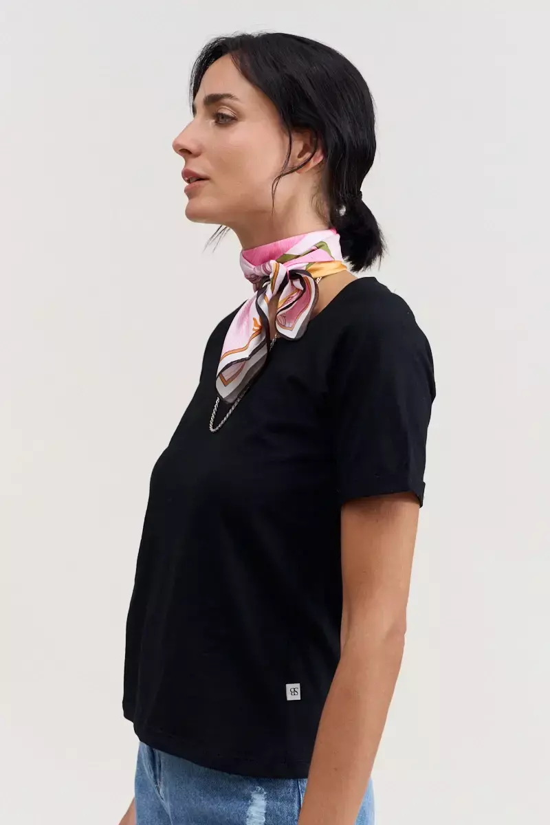 Remera manga corta de jersey de algodón. Tiene manga ranglan con ruedo atracado hacia afuera. La modelo usa talle Small. Las medidas de una prenda talle small son: Contorno de pecho: 91cm/ Largo: 54cm