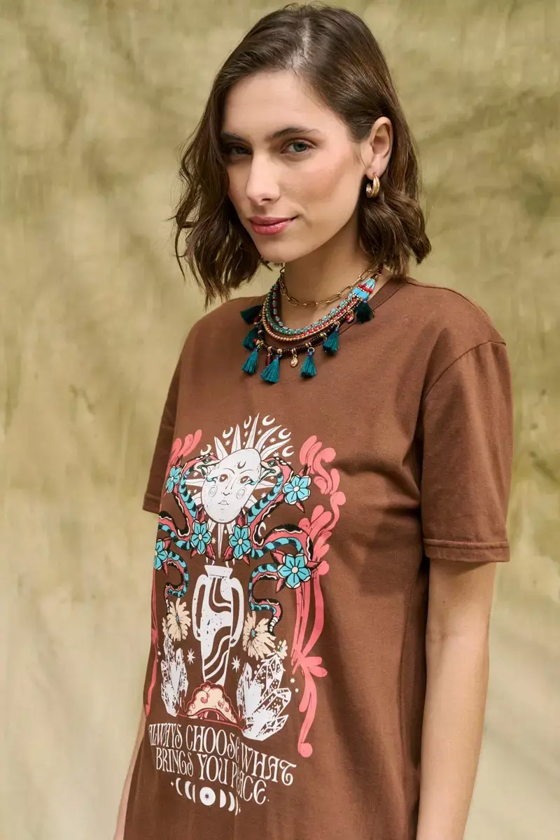 Remera de jersey de algodón con estampa en el frente. La modelo usa talle Small. Las medidas de una prenda talle Small son: Ancho de espalda:: 45cm/ Contorno de pecho: 98cm/ Largo: 70cm