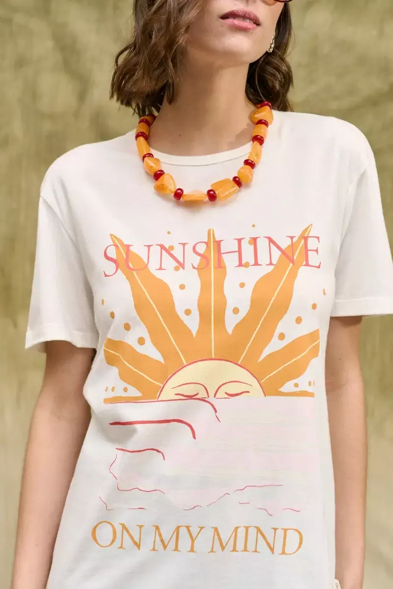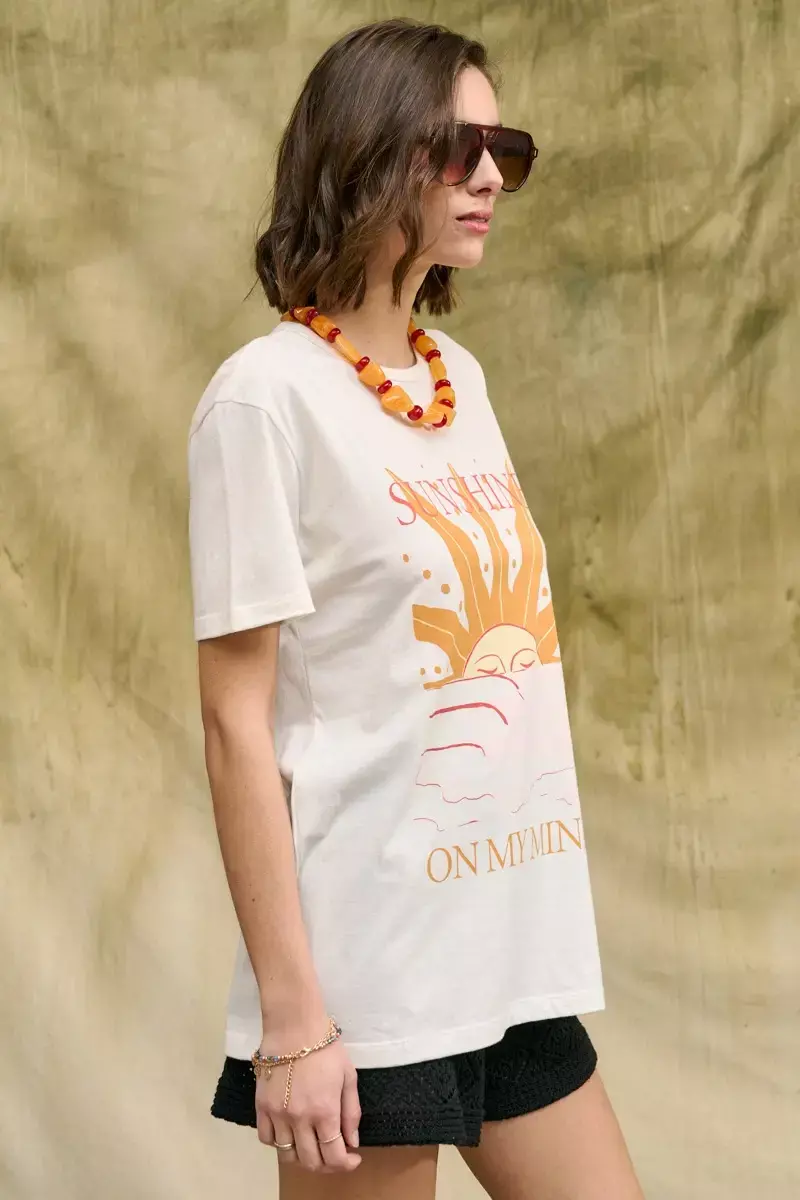 Remera de jersey de algodón, con escote redondo y estampa centrada en delantero. La modelo usa talle Small. Las medidas de una prenda talle Small son: Contorno de pecho: 100cm/ Largo: 70cm