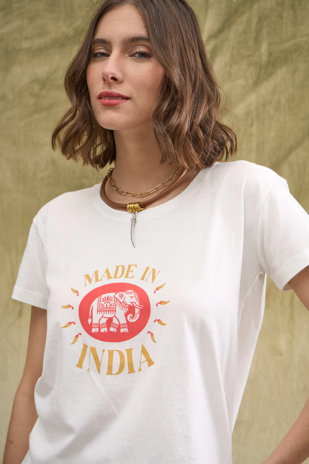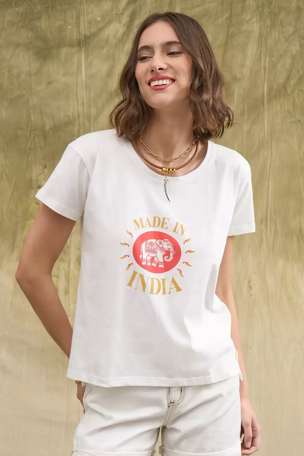 Remera confeccionada en jersey de algodon. Posee mangas cortas y cuello redondo. Estampa centrada en el delantero. Largo irregular, es mas larga la espalda que el frente. La modelo usa talle Small. Medidas talle S: Largo total: 61 cm / Ancho de hombro: 13 cm / Largo de manga: 13 cm / Contorno de pecho: 98 cm