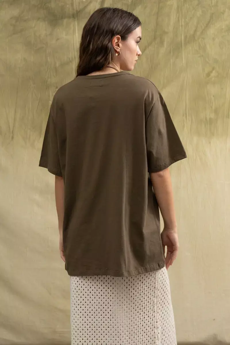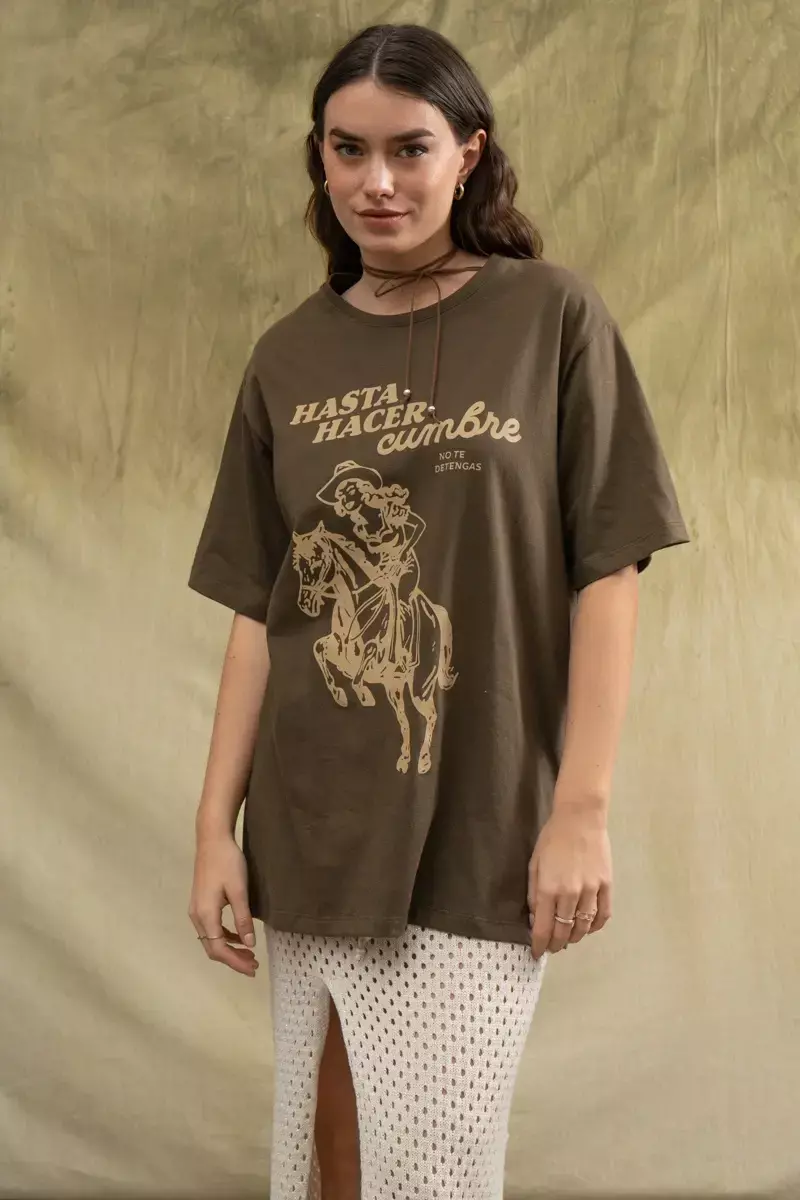 Remerón de jersey de algodón con estampa en el frente. La modelo usa talle Small. Las medidas de una prenda talle Small son: Ancho de espalda: 49cm Contorno de pecho: 116cm Largo: 72cm