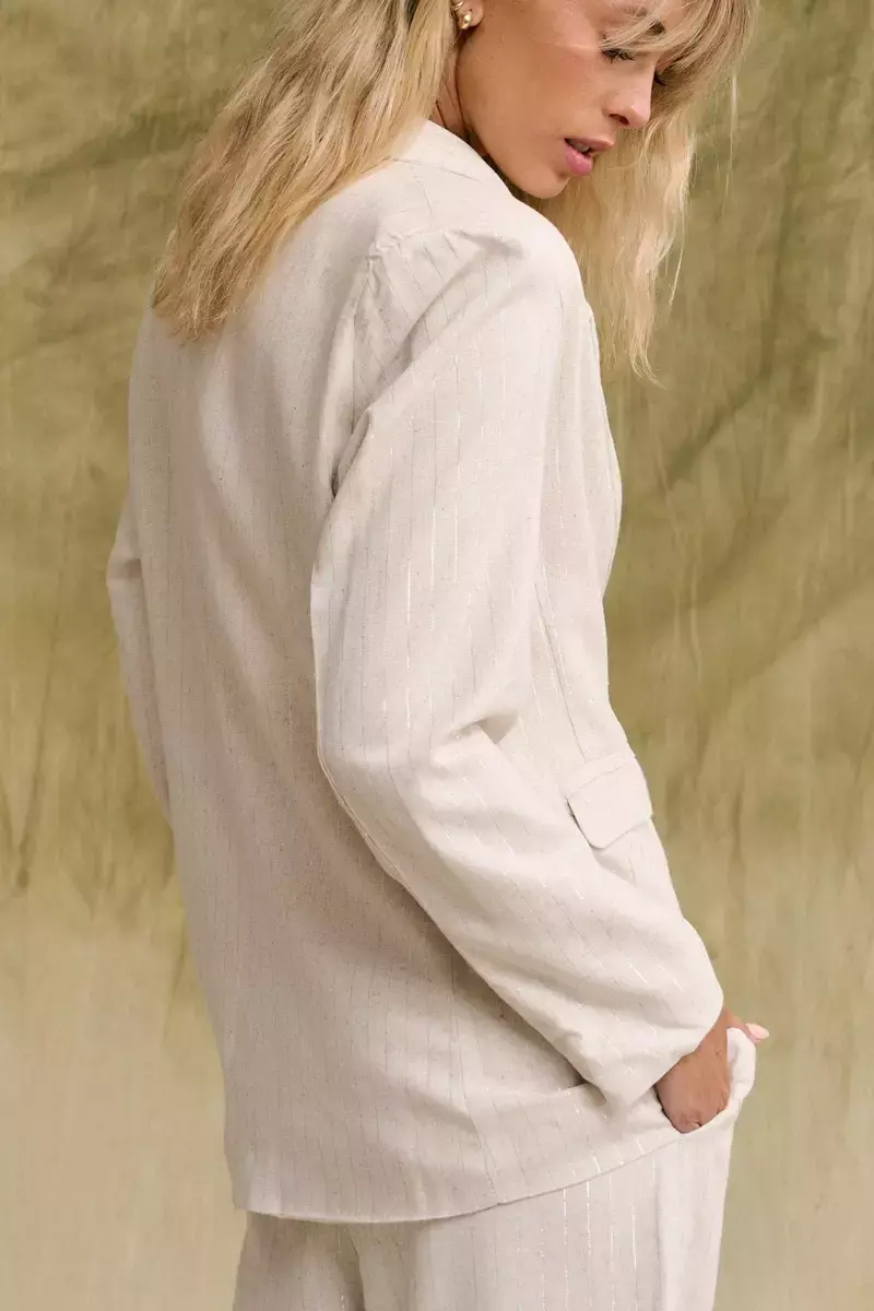 Saco confeccionado en lino a rayas con lurex. Modelo oversize. Solapas amplias y bolsillos en delantero. Acceso a la prenda a traves de botones a tono. La modelo usa talle Small. Medidas talle S: Largo total: 67 cm / Contorno de busto: 102 cm / Ancho de hombro: 12 cm / Largo de manga: 52 cm.