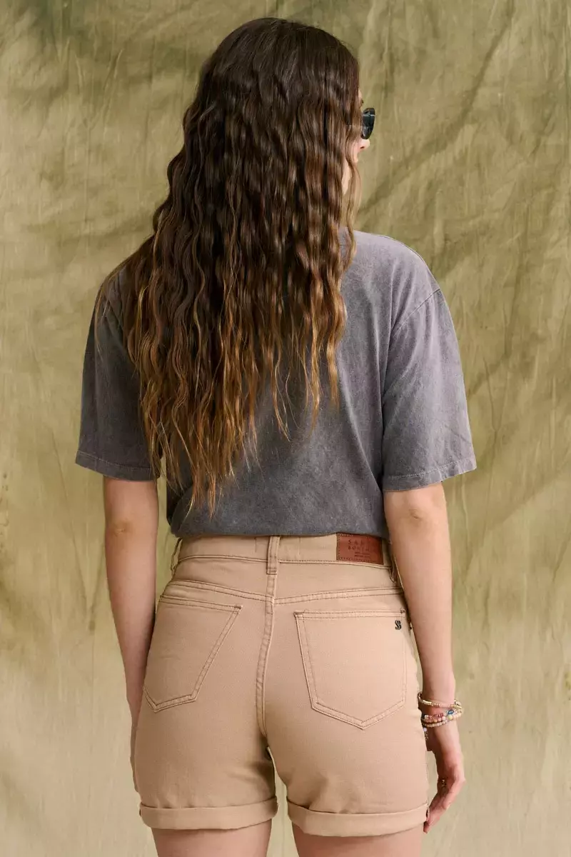 Short calce mom tiro alto confeccionado en tela 100 % algodon. Calce ajustado en cintura y suelto desde la cadera. Ruedo con doblez. Avios en plata vieja, detalle de chapita de marca en bolsillo trasero y etiqueta de marca en cintura color marron. La modelo usa talle 24. Medidas del talle 24 son: Cintura 66 cm, cadera 90 cm, tiro delantero 29 cm, tiro trasero 37 cm, largo 36 cm.