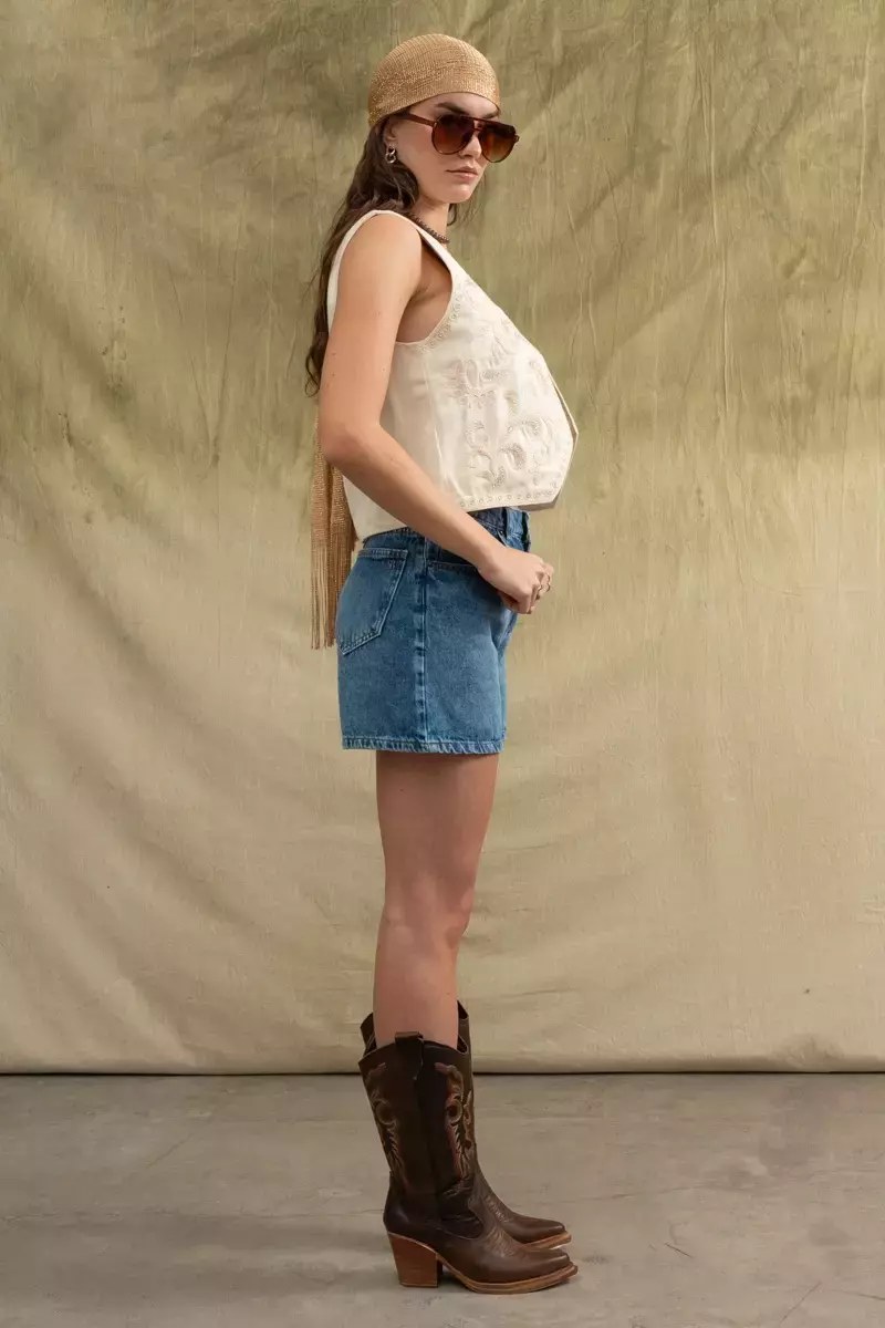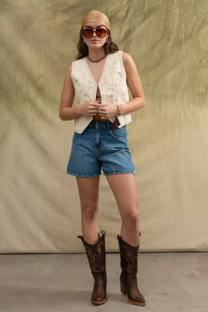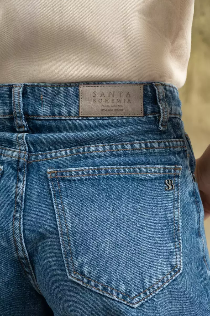 Short corte mom confeccionado en denim 100% algodon. Hilo camel. Lavado azul, leve localizado. Avios en plata vieja y badana en cintura color gris. Corte suelto a partir de la cadera, con ruedo. La modelo usa talle 24. Las medidas del talle 24 son: Contorno de cintura 64 cm/ Contorno de cadera 90 cm/ Tiro delantero 29 cm/ Tiro trasero 37 cm/ Largo 37 cm.