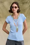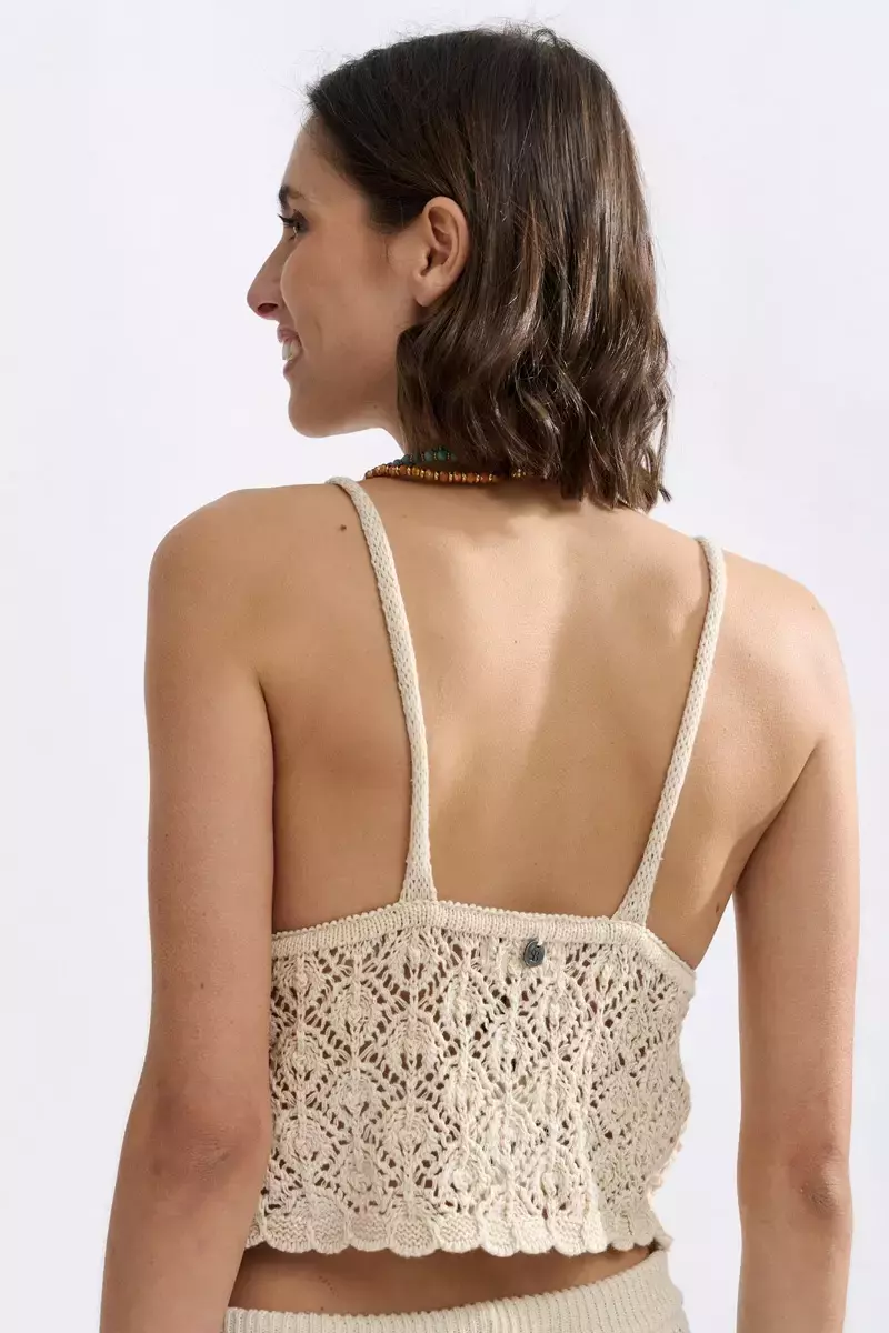 Top tejido de algodón con detalles de lurex. Posee cordon para anudar en el delantero. La modelo usa talle Small. Medidas talle S: Contorno de pecho: 64cm/ Largo total: 40cm
