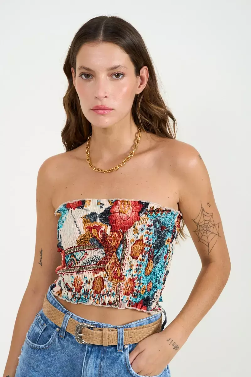 Top tipo bandeau completamente elastizado, confeccionado en seda Sari. Producto confeccionado en India. La prenda viene dentro de una bolsita confeccionada en la misma misma seda Sari. La modelo usa talle S/M. Medidas talle S/M: Largo total: 25 cm / Contorno de pecho: 62 cm
