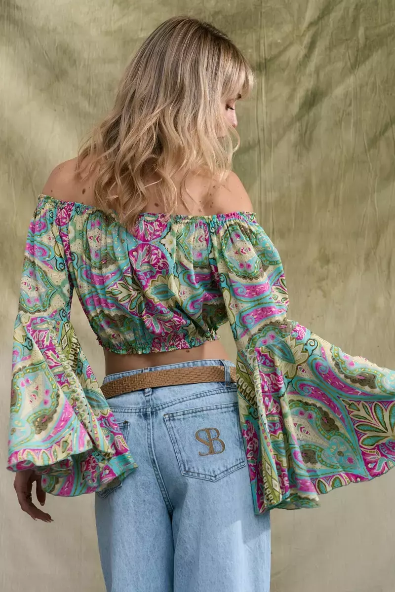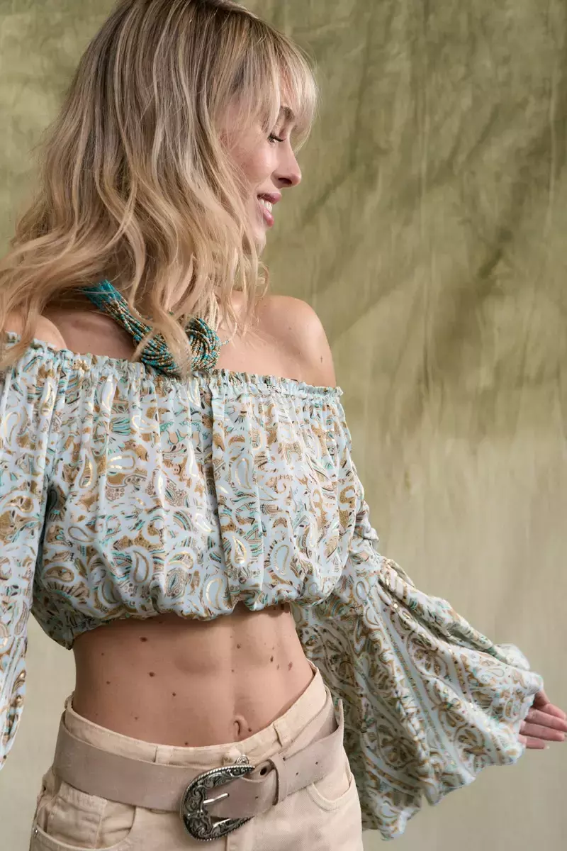 Top corto de mangas largas acampanadas. Posee elástico fruncido en escote y en ruedo. Prenda fabricada con piezas enteras de seda de sari y por su forma de confección, la estampa puede variar entre uno y otro, haciendo que cada una sea única. Confeccionada con hilos dorados, propios del género. La prenda viene dentro de una bolsita confeccionada en la misma tela base. Prenda fabricada en India. La modelo usa talle S/M. Medidas talle S/M: Largo total: 30 cm / Contorno de busto (estirado): 104 cm / Ancho de hombro + Largo de manga: 55 cm