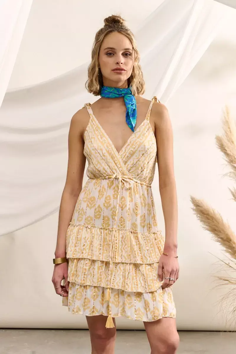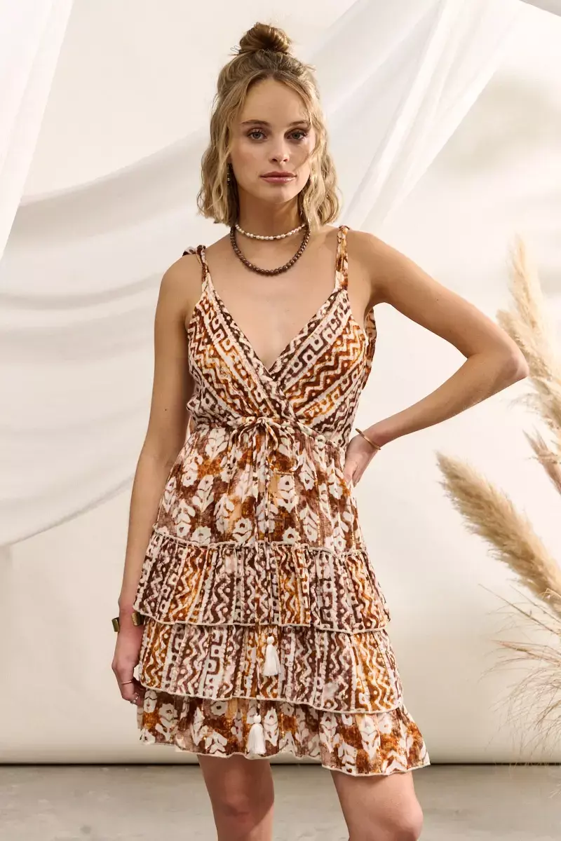 Vestido corto con breteles que se atan en los hombros, confeccionado en rayon creppe estampado. Modelo amplio, cruzado con escote V, suelto con muy buena caída. En la base inferior cuenta con amplios volados que le otorgan mayor vuelo a la prenda. Posee espalda completamente elastizada y tiras para anudar en el delantero. Prenda confeccionada en India. La modelo usa talle S/M. Medidas tale S/M: Largo total: 90 cm / Contorno de busto: 60 cm