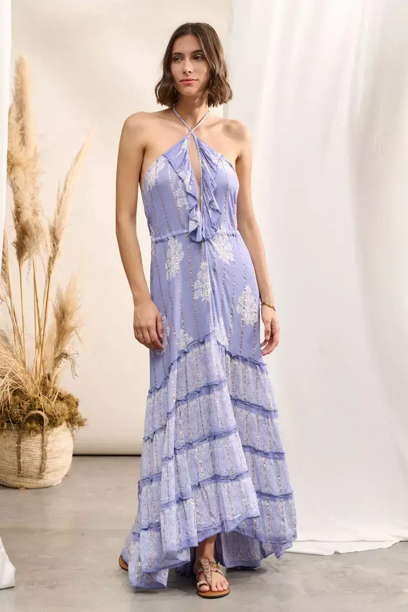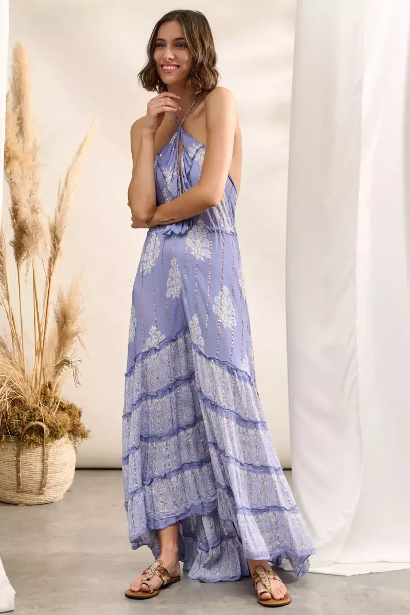 Vestido largo con breteles regulables confeccionado en rayon creppe estampado. Modelo amplio con escote V, suelto con muy buena caída. En la base inferior cuenta con amplios volados que le otorgan mayor vuelo a la prenda. En el bajo busto cuenta con un lazo con borlas y cuentas doradas para atar regulando al contorno del torso. Se ata al cuello y posee espalda descubierta. La prenda viene dentro de una bolsita confeccionada en la misma tela base. Prenda confeccionada en India. La modelo usa talle S/M. Medidas talle S/M: Largo total: 165 cm / Contorno de busto: 80 cm