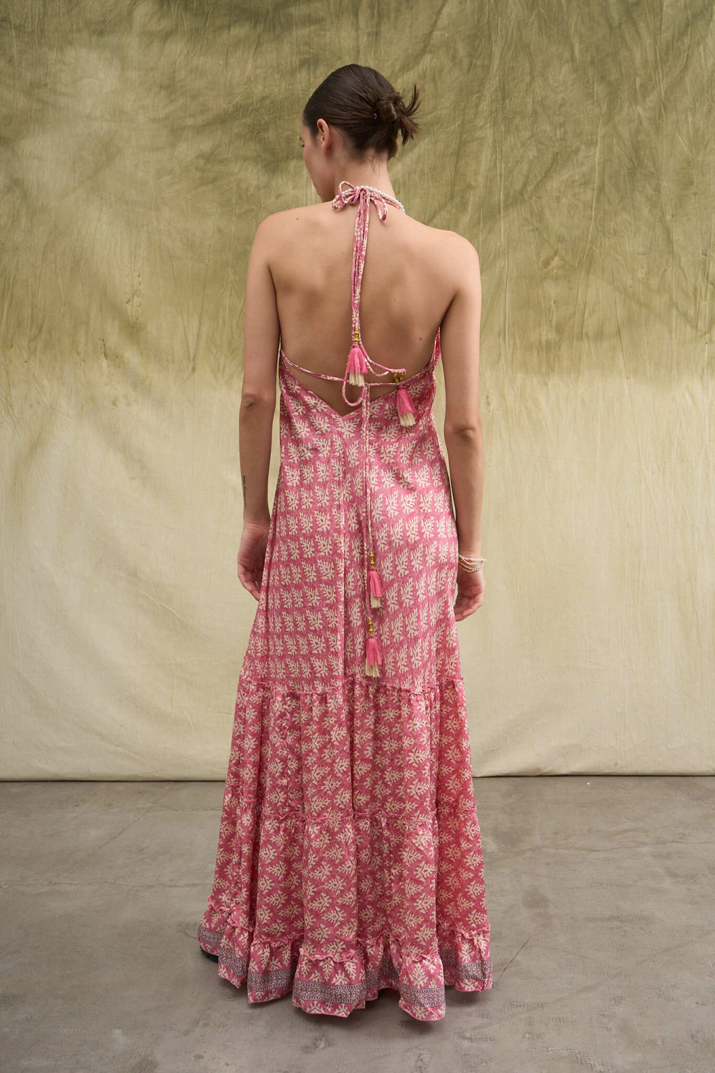 Vestido largo con breteles regulables confeccionado en Seda de Sarí estampada. Modelo amplio con escote V, suelto con muy buena caída. En la base inferior cuenta con 2 amplios volados que le otorgan mayor vuelo a la prenda. En el bajo busto cuenta con un lazo con borlas y cuentas doradas para atar regulando al contorno del torso. Se ata al cuello y posee espalda descubierta. La prenda viene dentro de una bolsita confeccionada en la misma misma seda Sari. Prenda confeccionada en India. La modelo usa talle S/M.