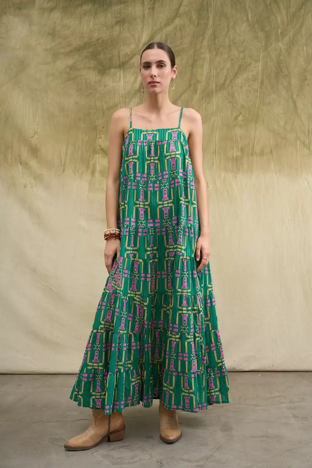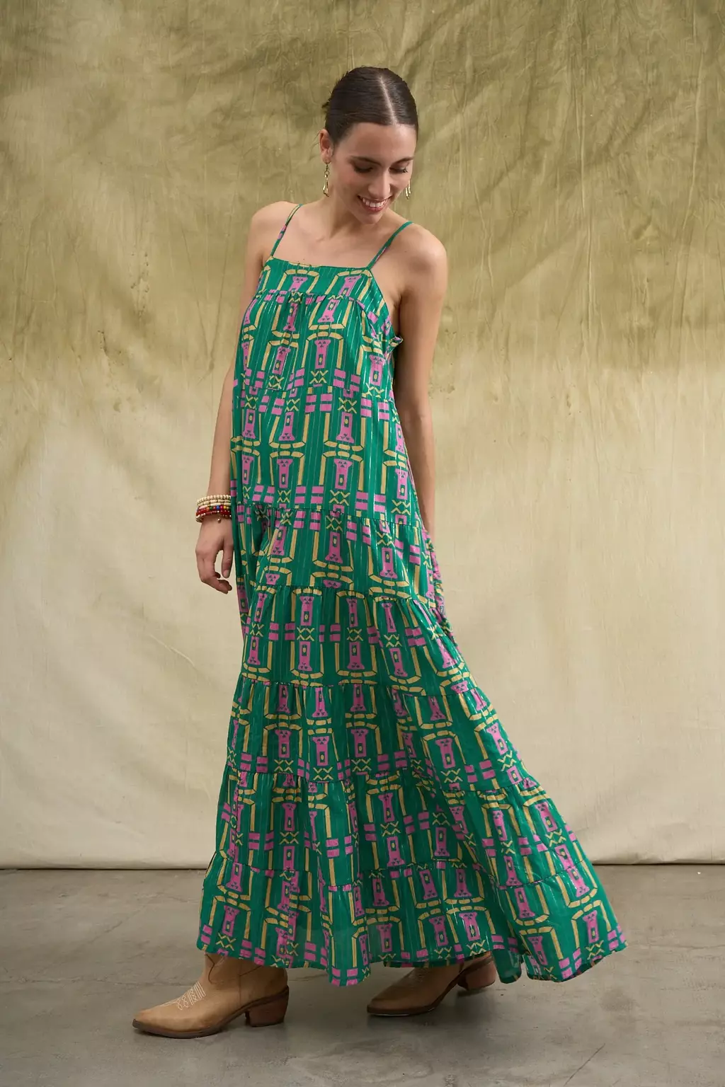 Vestido largo estampado con diseño exclusivo y detalle de hilos de lurex en todo su recorrido. Breteles finos regulables Posee bolsillos laterales Prenda confeccionada en India. La modelo usa talle S/M. Medidas talle S/M: Largo total: 130 cm / Contorno de busto: 92 cm.