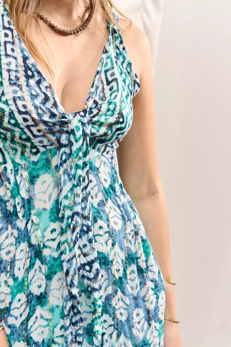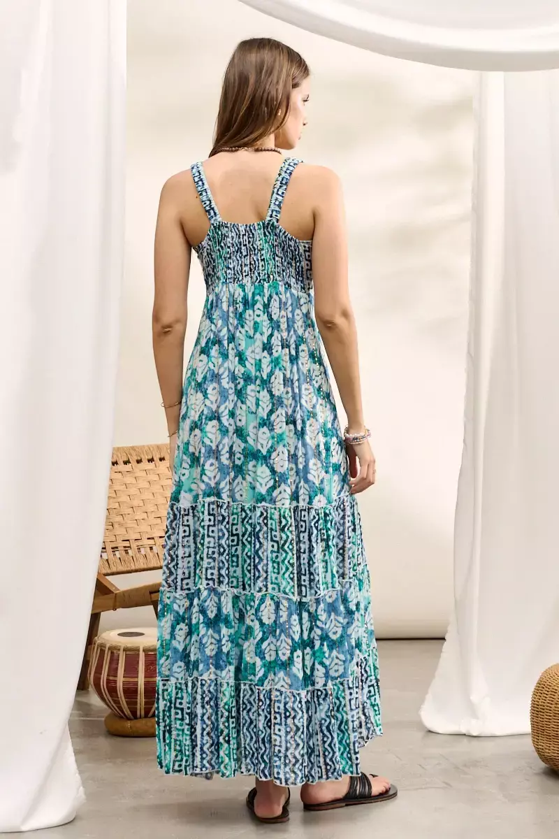 Vestido largo confeccionado en rayon creppe estampado. Posee breteles elastizados en espalda. Top que se anuda en el delantero y volados en falda. La prenda viene dentro de una bolsita confeccionada en la misma tela base. Prenda confeccionada en India. La modelo usa talle S/M. Medidas talle S/M: Largo total: 148 cm / Contorno de busto: 80 cm.