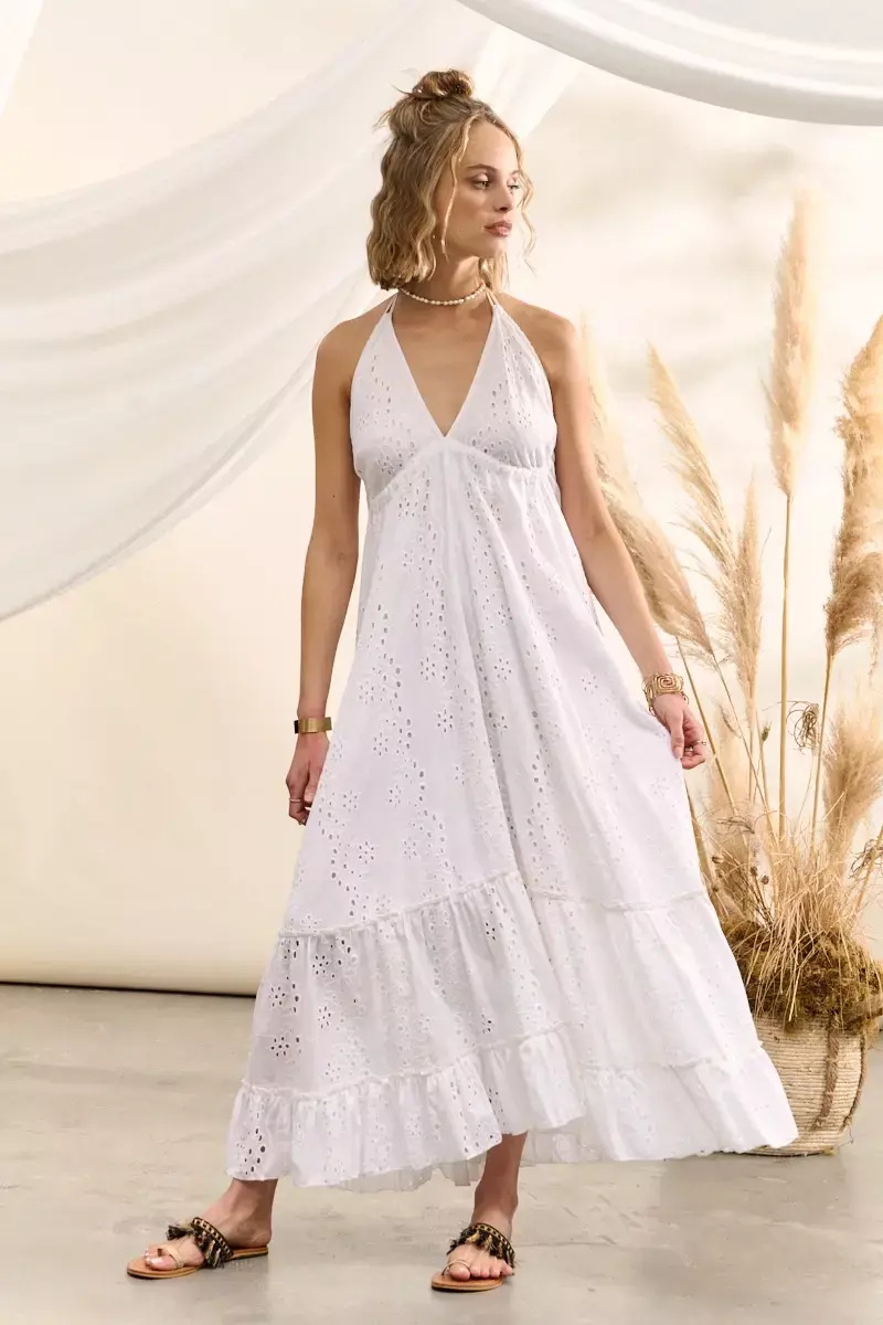 Vestido largo con breteles regulables confeccionado en broderie Modelo amplio con escote V, suelto con muy buena caída. En la base inferior cuenta con 2 amplios volados que le otorgan mayor vuelo a la prenda. En el bajo busto cuenta con un lazo con borlas y cuentas doradas para atar regulando al contorno del torso. Se ata al cuello y posee espalda descubierta. Prenda confeccionada en India. La modelo usa talle S/M. Las medidas de nuestra modelo son: Busto: 87 cm / Cintura: 61 cm / Cadera 92 cm.